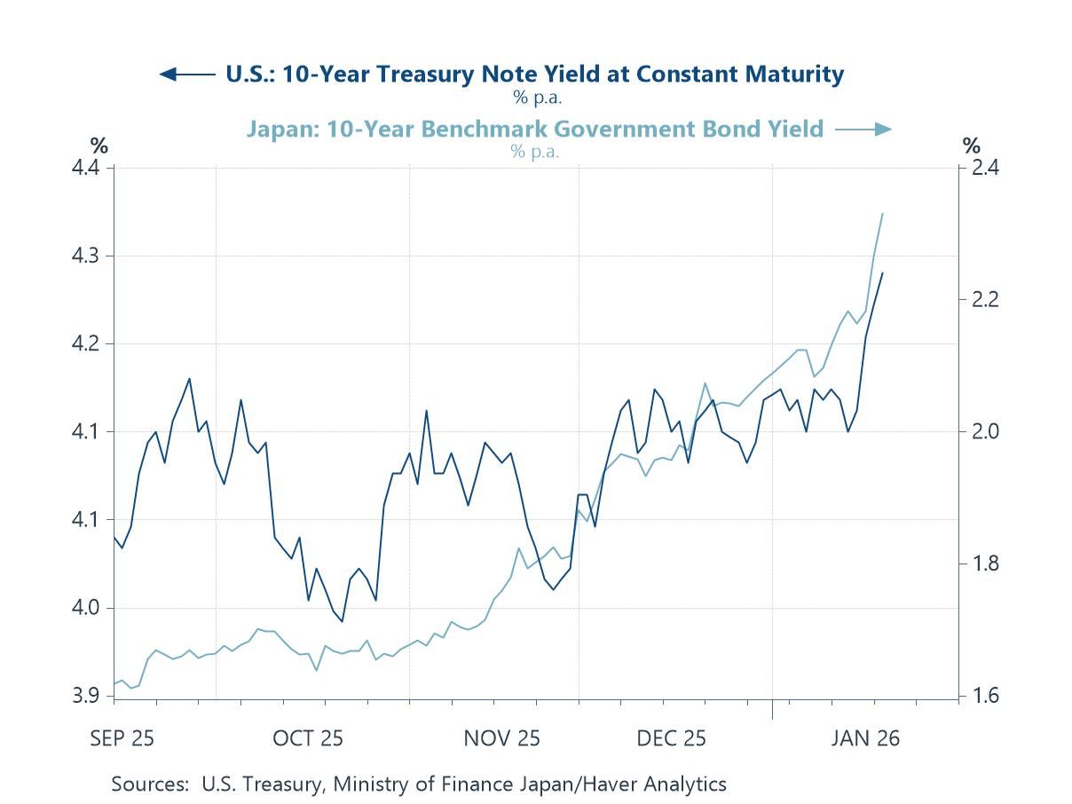 Japan’s JGB yields That said, recent capital outflows from US assets may owe as much to developments in Japan as to geopolitical and trade-related shocks. While tariff threats and policy unpredictability have clearly unsettled sentiment, an underappreciated driver of the sell-off in US Treasuries has been the sharp repricing in the Japanese government bond market. Renewed domestic political uncertainty and intensifying concerns over Japan’s debt dynamics have triggered a rapid rise in JGB yields, prompting portfolio rebalancing by Japanese investors and reducing the relative appeal of US duration. Given Japan’s role as one of the largest foreign holders of US Treasuries, yield gyrations at home can translate quickly into capital repatriation, hedging adjustments and reduced demand for US bonds. In this sense, recent moves in US yields may reflect less a direct reaction to geopolitical risk and more a globally transmitted capital-flow shock—originating in Japan but felt most acutely in US financial markets.