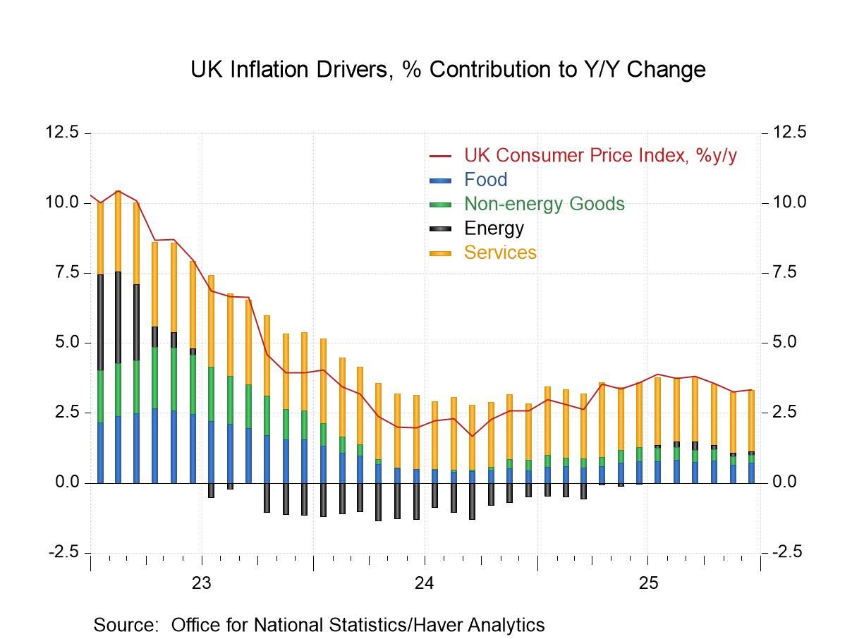 UK inflation UK inflation data released this week show a small upside surprise in headline CPI at year-end. Headline CPI inflation specifically rose from 3.2% y/y in November to 3.4% in December, a little more than expected. The chart below shows that the pickup was driven by persistent underlying pressures—most notably in services. While a negative drag from energy prices has largely faded, services inflation continues to account for a disproportionate share of overall price growth, probably reflecting ongoing wage pressures and limited slack in parts of the domestic economy.