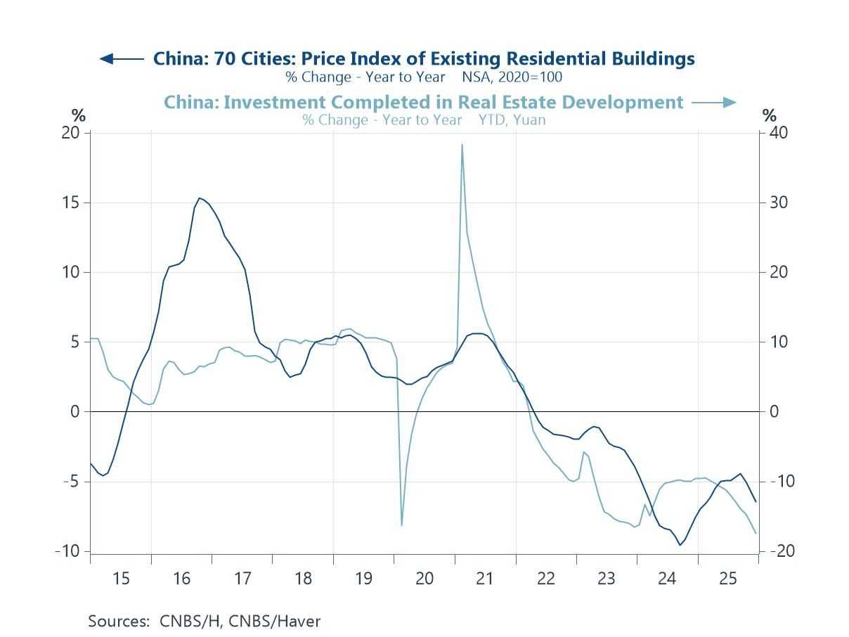 China’s property market Finally, the Q4 GDP figures released in China this week sit uneasily alongside continued weakness in its domestic property sector, which remains a key drag on both investment and consumption. While Q4 growth of 4.5% y/y brought full-year GDP broadly in line with the authorities’ 5% target, the chart highlights how property-market adjustment is still running deep beneath the surface. Prices of existing homes across China’s 70 cities remain in year-on-year decline, while real estate investment continues to contract sharply, underscoring the scale and persistence of the sector’s retrenchment. This helps explain why fixed asset investment has softened further and why household demand remains subdued, despite more resilient industrial output.