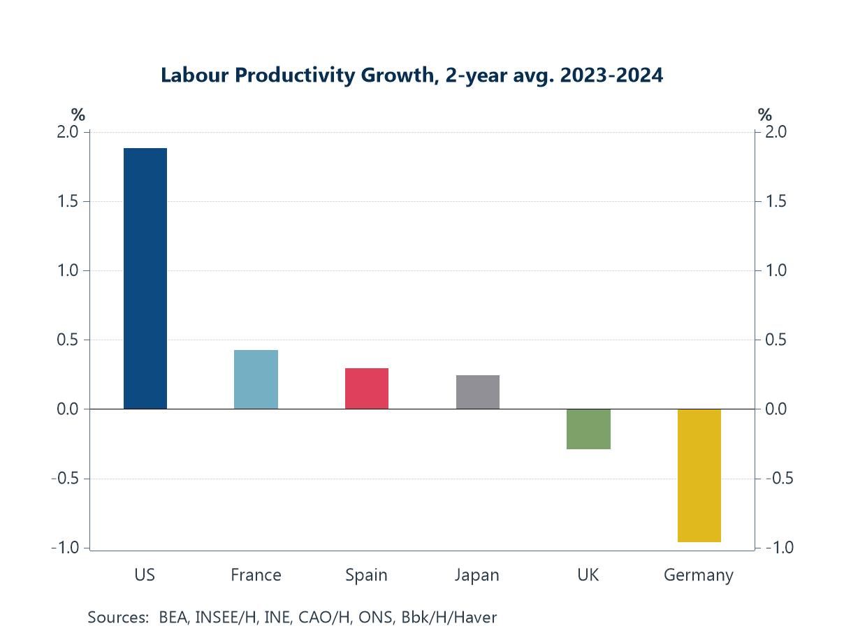 Labour productivity trends As the next chart below indicates the US has outpaced peer economies on labour productivity in recent years. That’s a function of a number of factors including faster capital deepening and - arguably - a quicker diffusion of digital technologies. Surging investment in software, cloud and data-centre infrastructure—bolstered by deep capital markets and policy supports—has lifted output per hour in tech-heavy sectors and spilled over into business services. A flexible labour market has also arguably reallocated workers toward higher-productivity firms more rapidly than in Europe or Japan. Sector mix and energy costs matter too: the US has a much larger footprint in high-value services and enjoyed a relative energy-price advantage since 2022, while Germany and the UK faced an energy-intensive manufacturing slump that depressed measured productivity.
