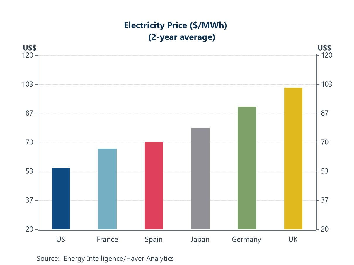 Electricity prices That linkage shows up starkly in electricity costs. The two-year average electricity price has been far lower in the US than in Europe or Japan, with France and Spain higher, Japan higher still, and Germany and the UK at the top end. The mapping to productivity is almost one-for-one: cheaper power supports capex, keeps energy-intensive inputs and data-centre compute affordable, and sustains margins in high-value services; expensive power squeezes manufacturers, curtails utilisation, and drags on measured output per hour. In other words, the same energy-price wedge that has undercut Germany and the UK since 2022 has amplified the US edge—helping explain why recent productivity gains have clustered where electricity is cheapest.