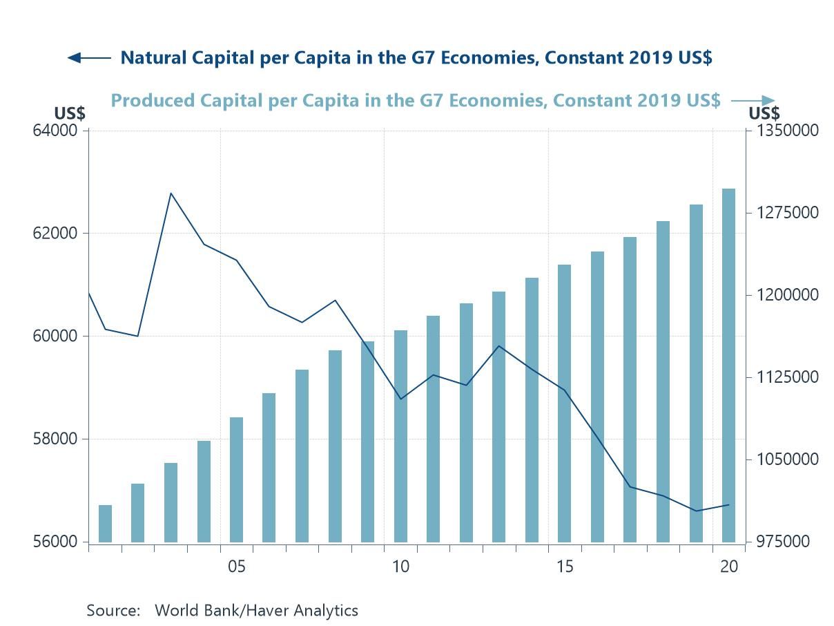 Natural capital The split in the next chart is telling: while produced capital per capita across the G7 economies has marched higher, natural capital per capita has drifted lower for most of the past decade. That erosion has arguably become central to the more active debate about why global productivity has struggled—depleted natural assets and tighter environmental constraints tend to raise real (inflation-adjusted) energy costs, increase maintenance and mitigation spending, and divert investment from expansion to replacement and resilience. In practice, more capex goes into hardening grids, meeting environmental standards, remediating land and water, and sourcing costlier energy inputs—outlays that protect activity but add less to measured output per hour. The result is a thinner productivity fabric: higher operating costs, slower diffusion of new capacity, and weaker multiplier effects from investment. In short, the gains in produced capital are increasingly offset by the drawdown of natural capital.