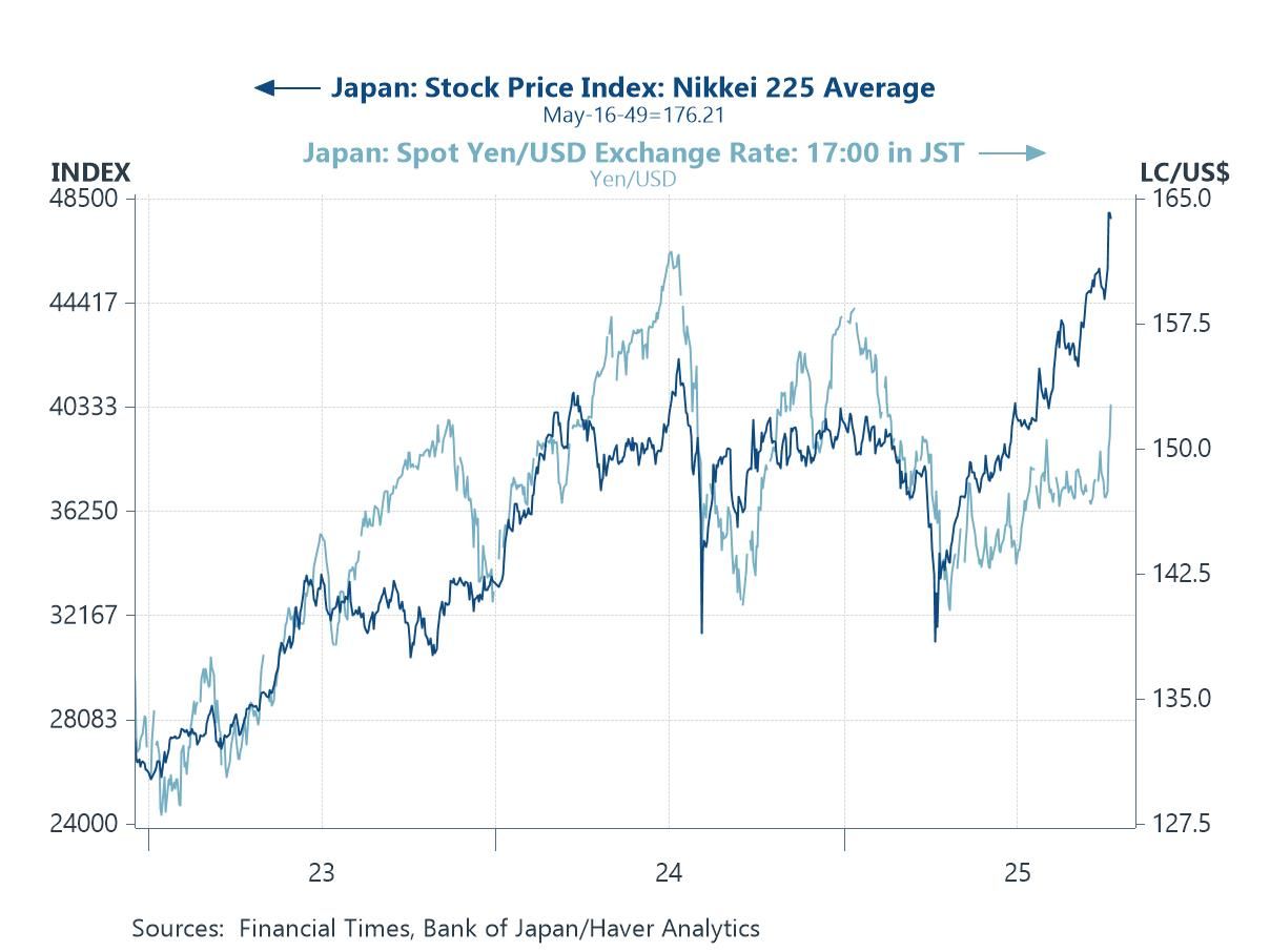 Chart 5: Japan’s financial markets: The Nikkei 225 average versus the USD/JPY exchange rate