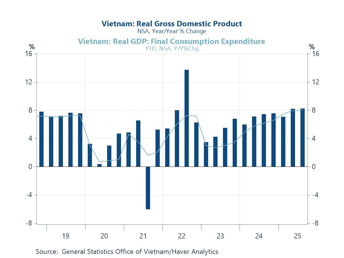 Vietnam’s economy Vietnam has been in the headlines this week with Q3 GDP showing a steady re-acceleration. As the final chart below indicates, real GDP growth is pushing back toward the top of its post-pandemic range, with year-to-date household consumption firming alongside it—signs that the recovery is broadening beyond exports. Tailwinds include a rebound in electronics orders, ongoing supply-chain diversification into Vietnam, tourism’s return, and earlier monetary easing. But the outlook is not without hazards: escalating US tariff policies—both broad measures and sector-specific actions on tech and green goods—could disrupt export demand and complicate rules-of-origin strategies that currently favour Vietnam as a “China-plus-one” hub. Add lingering property-sector repair and infrastructure bottlenecks, and the near-term growth path remains constructive but sensitive to US trade developments.
