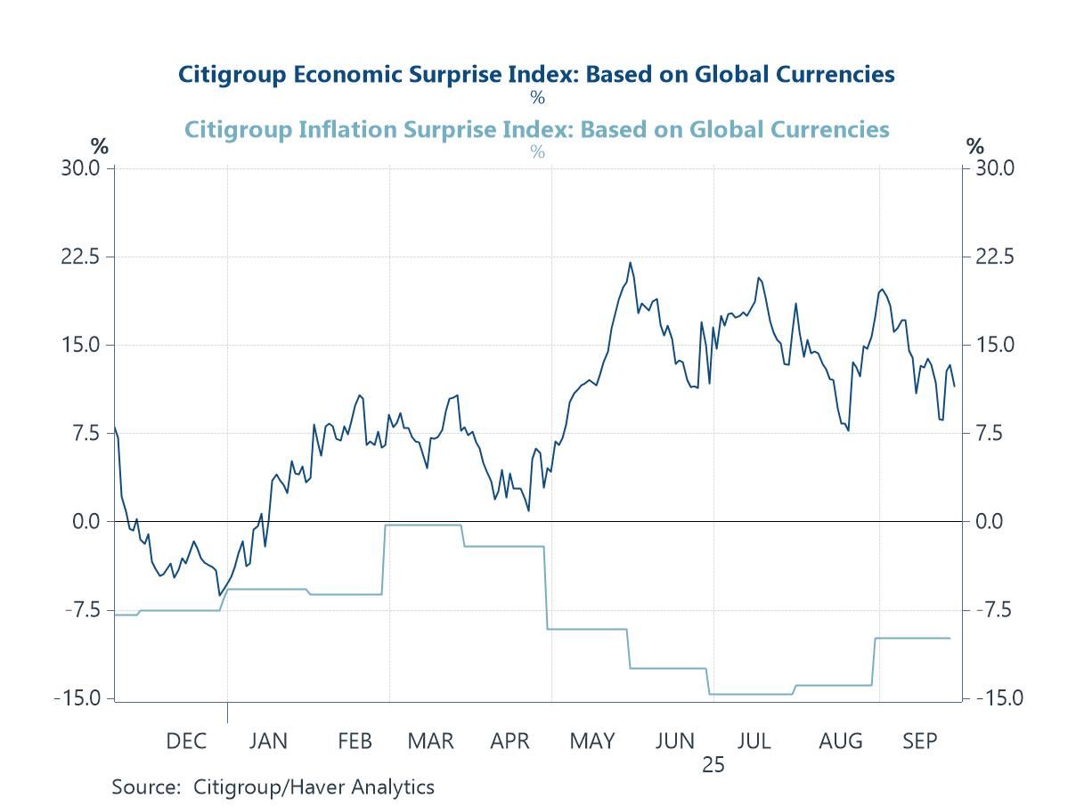 Signals of supply-side resilience Equity markets have been buoyed by hopes that AI-driven productivity gains will provide a new leg of support for global growth, though hard evidence in the macro data remains elusive. One encouraging sign, however, comes from high-frequency indicators such as the Citigroup Economic Surprise Index, which has shown a steady run of upside surprises in global growth data over the past several months. At the same time, the Inflation Surprise Index has persistently undershot expectations, pointing to milder-than-feared price pressures. Taken together, these developments hint at possible supply-side improvements—consistent with the idea that productivity may be quietly strengthening, even if traditional measures are slow to capture it. The question for investors is whether this early pattern is sustainable or merely a temporary alignment of cyclical forces.