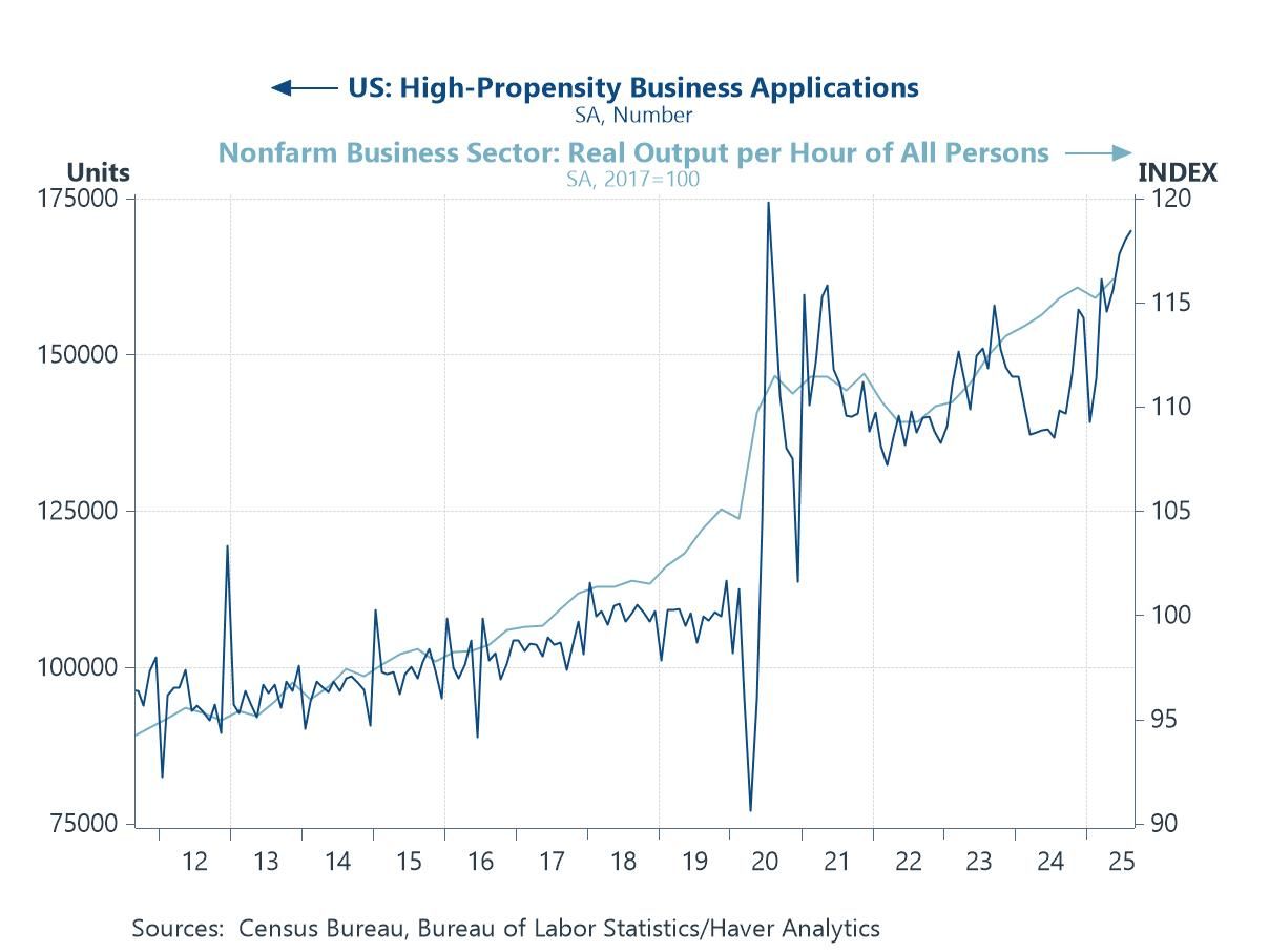 US company formation Another piece of evidence that hints at a possible shift in US productivity dynamics comes from the combination of rising business formation and stronger measured output per hour. Applications for high-propensity businesses—those most likely to generate sustained employment—have climbed markedly in recent years, and in parallel official productivity data have also shown a clear upturn since the pandemic shock. While both series are volatile and subject to revision, the persistence of this improvement suggests that the US may be entering a more dynamic phase of firm creation and efficiency gains. If AI adoption is acting as a catalyst for both new business models and more efficient production, then these developments could represent an early macro-level reflection of that trend.