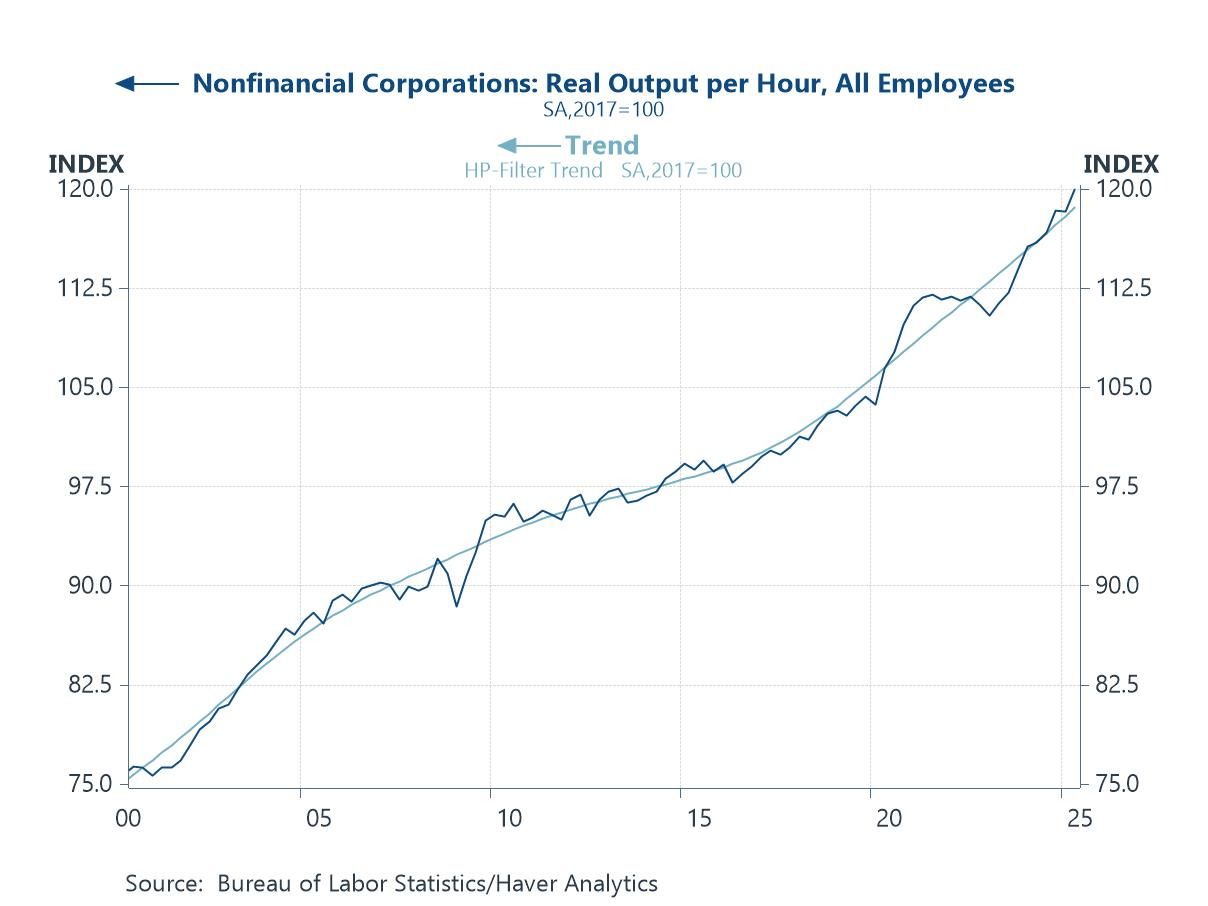 US productivity trends Formal productivity gauges for the non-financial corporate sector have lifted above trend, but the rebound should be treated cautiously. Much of the recent strength may reflect post-COVID normalization—hours and capacity settling after stop-start disruptions, compositional shifts as weaker firms exited and re-entered, and cyclical capital deepening as investment caught up—alongside measurement noise and future revisions. These data are consistent with the possibility of underlying efficiency gains, including from digital and AI adoption, but they are not yet proof of a structural break. We’ll need sustained outperformance across multiple data vintages—and through a softer growth patch—to distinguish a true productivity revival from a cyclical bounce-back.