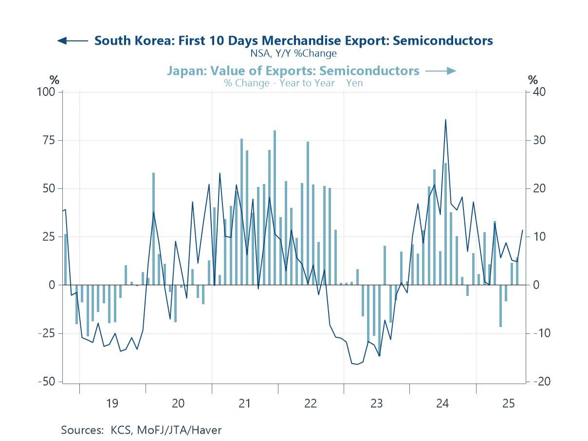 Semiconductor trade One area where the footprint of AI investment is already visible is in the semiconductor trade data. South Korea’s early export figures and Japan’s shipment values both show a sharp rebound over the past year, reversing the slump seen in 2022–23. Given that advanced chips are the essential input for AI infrastructure—from data centres to training models—this recovery provides a tangible sign of how global demand is being reshaped by the AI buildout. While semiconductor cycles are notoriously volatile and influenced by broader electronics demand, the scale and persistence of the current upswing suggest something more structural may be at play, reinforcing the idea that AI-related capital spending is starting to leave a measurable imprint on global trade flows.
