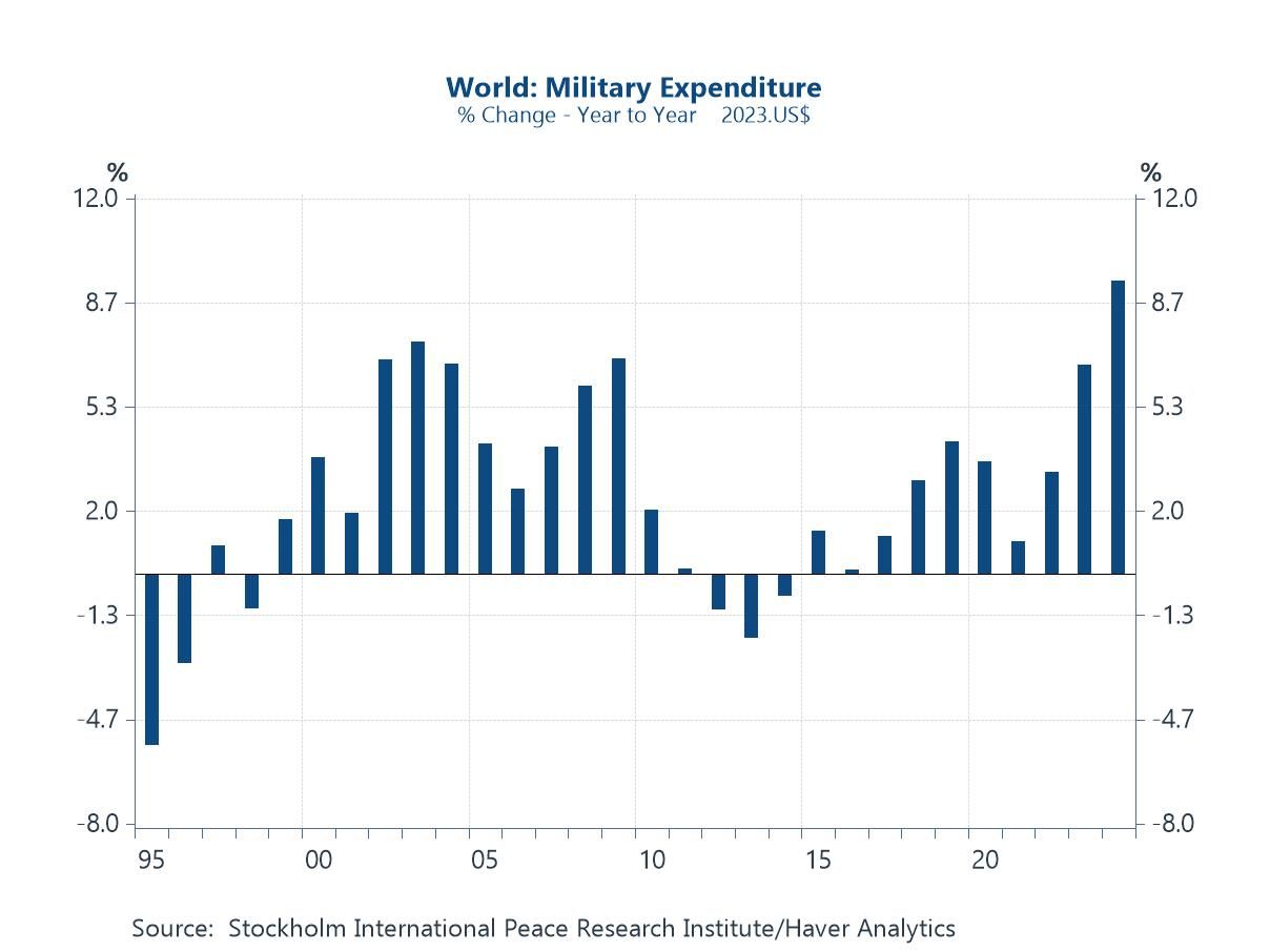 Global defence spending While AI investment has dominated headlines as a prospective driver of global growth, it is important not to overlook other forces shaping capital spending. Defence outlays have accelerated, and while they are often prompted by geopolitical risk, parts of this spending can be productivity-enhancing—for example, investment in cyber security, advanced computing, space and satellite networks, resilient supply chains, and dual-use manufacturing that diffuses into the civilian economy. Even so, the opportunity cost and signalling effect of higher military budgets matter: they can crowd out other forms of capex, and the underlying uncertainty can weigh on trade, supply chains, and investor confidence. Taken together, these dynamics argue for caution: the AI boom may be fostering optimism about a new productivity era, but the broader backdrop—marked by rising defence demand with mixed spillovers and uneven sources of capex—still leaves the outlook fragile.