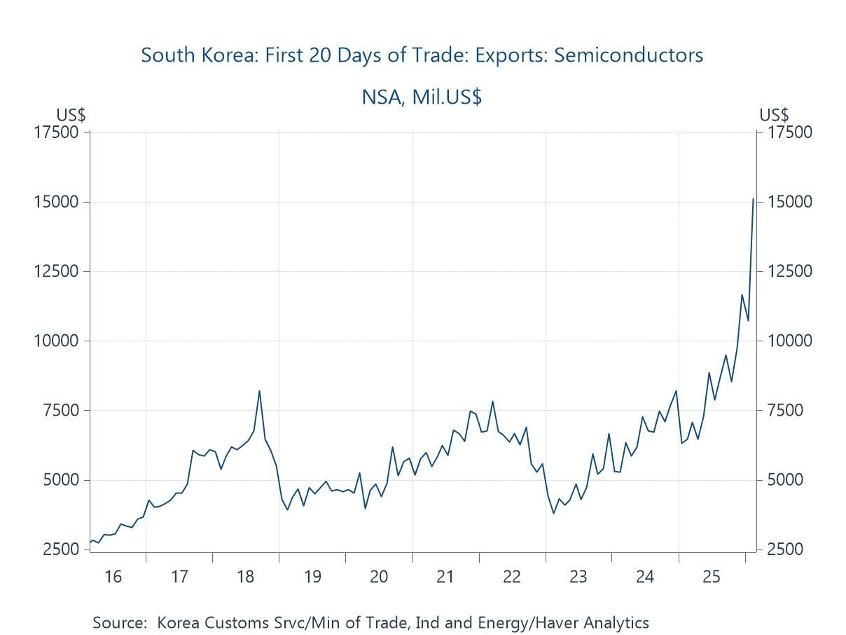 South Korea’s Semiconductor Trade One factor helping to sustain global activity may well be the ongoing AI investment cycle, and Korea’s semiconductor exports provide a timely illustration. As the chart shows, shipments in the first 20 days of February have surged to fresh highs, extending the powerful upswing seen over the past year. Given Korea’s central role in the global memory and advanced chip supply chain, this strength is unlikely to be purely cyclical. Instead, it is consistent with continued heavy demand linked to data centres, high-performance computing and broader AI infrastructure build-out. In that sense, while parts of the global economy show signs of cooling, the AI capex cycle appears to be providing an important offset — reinforcing trade flows and helping to keep overall activity on a firmer footing than might otherwise have been expected.