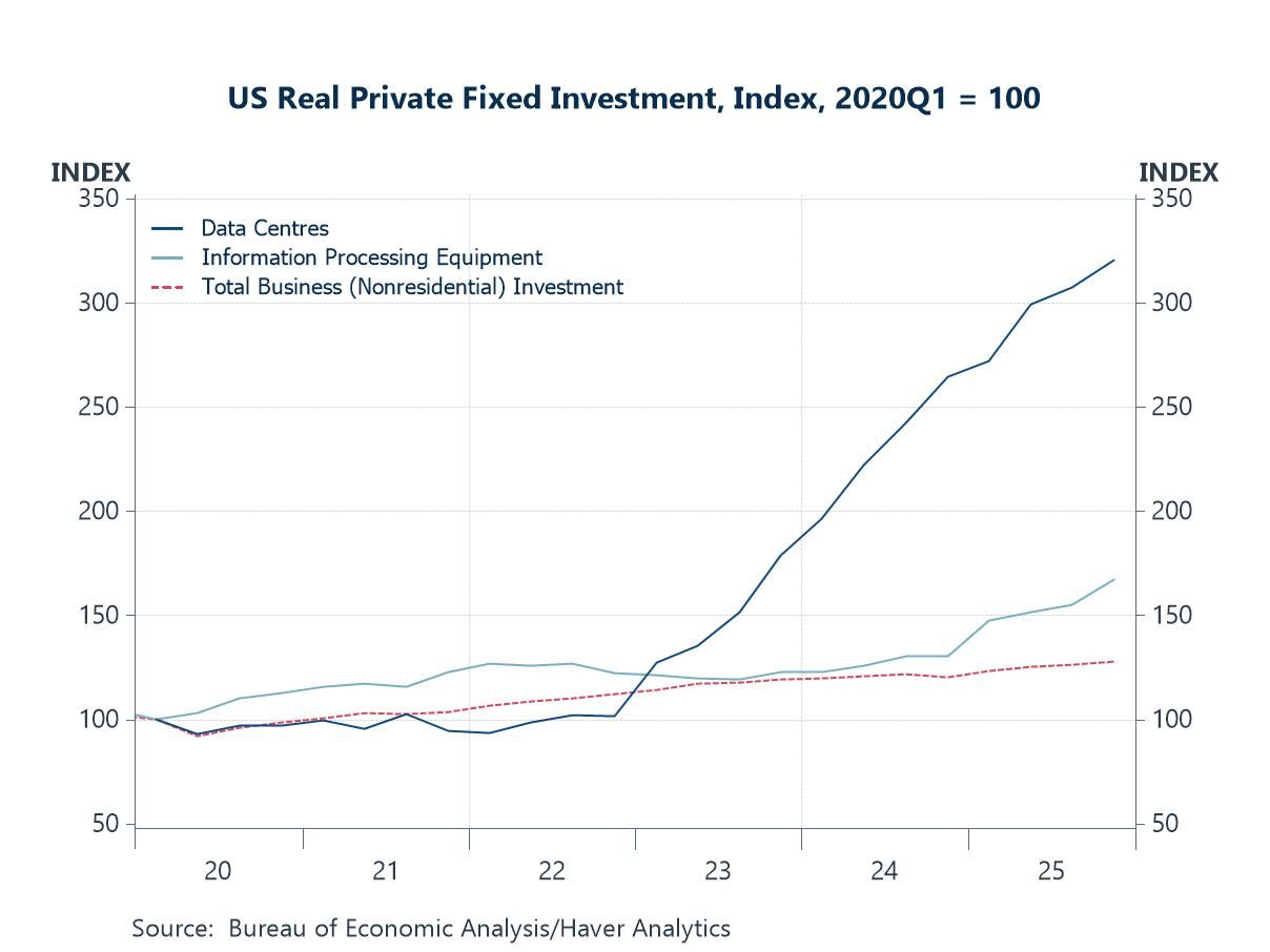 US Investment in Data Centres The surge in Korea’s semiconductor exports is echoed in the composition of US investment, where AI-related capital spending continues to accelerate. As the chart shows, real private fixed investment in data centres has risen sharply since 2022, significantly outpacing both information processing equipment and overall non-residential business investment. This divergence points to an ongoing, capital-intensive build-out of digital and cloud infrastructure, consistent with strong global demand for computing power. For markets, the key takeaway is that the AI investment cycle remains firmly in expansion mode, helping to underpin activity in both the US and the broader technology supply chain.