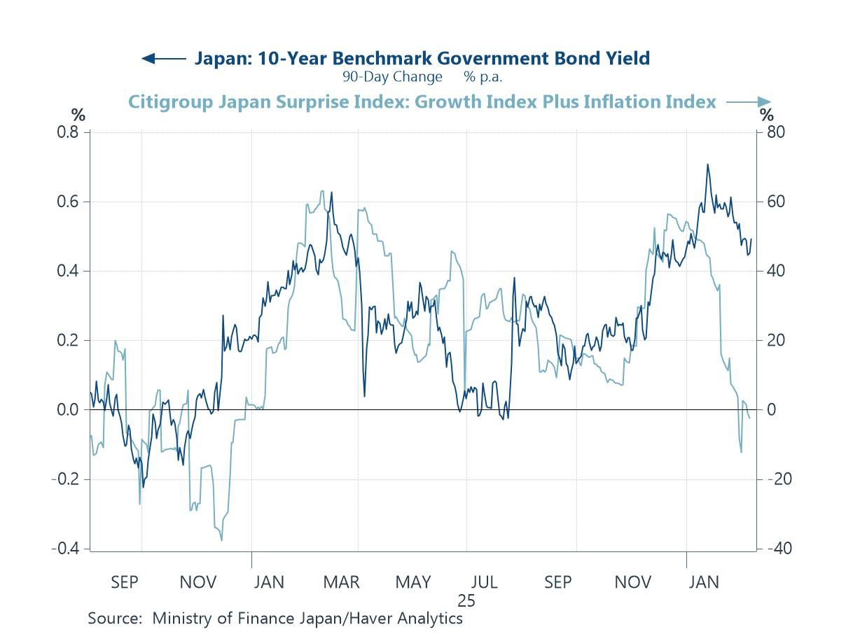 Japan’s 10-year JGB yields and data surprises Finally, developments in Japan’s bond market are also worth watching from a global perspective. The chart shows a clear relationship between the three-month change in 10-year JGB yields and the Citi Japan surprise indices, with yields tending to track shifts in the growth and inflation data flow. In recent weeks, the downward drift in JGB yields has been particularly notable. The move appears consistent with a run of softer-than-expected growth and inflation readings, which have tempered near-term tightening expectations. Given Japan’s outsized role in global capital markets and carry dynamics, even modest moves in JGB yields can have broader spillovers. To that extent, the recent pullback may have provided a mild anchoring influence on global bond markets at the margin, even as the broader normalization narrative remains intact.