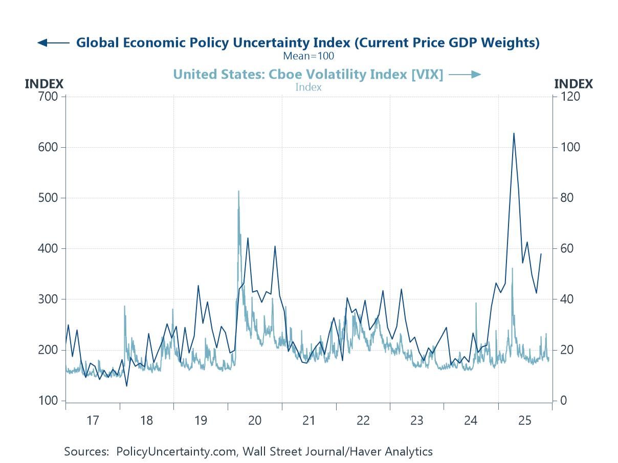 As 2025 draws to a close, the global economy enters 2026 with a surprisingly resilient backdrop: equity markets are still trading near cycle highs, volatility is subdued, and consensus forecasts have been drifting upward in recent months—helped by a robust US economy, firmer momentum across Asia, and optimism that AI-related investment will continue to lift the medium-term outlook (chart 1). Against this relatively constructive starting point, we focus this week on the key downside risks that could challenge the consensus narrative next year: the possibility of monetary-policy miscalibration (chart 2); the gap between elevated policy uncertainty and unusually calm financial markets (chart 3); the risk that financial markets may be overestimating the gains from AI (chart 4); renewed strain in global trade (chart 5); and geopolitical tensions (chart 6). These risks do not dominate the baseline outlook, but they help frame the vulnerabilities that could matter if global conditions deteriorate. Next week, we will turn to the upside risks—the forces that could allow the world economy to outperform again in 2026.