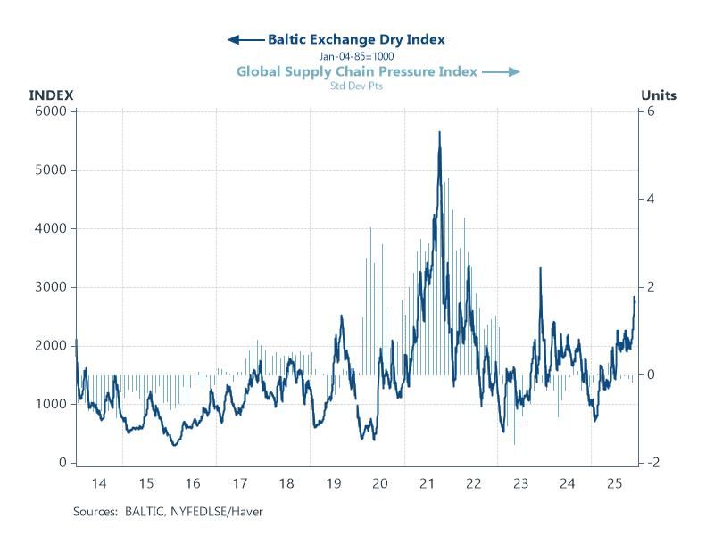 Trade disruption A further downside risk comes from the latent fragilities in global trade and logistics. The Baltic Dry Index has climbed sharply in recent months, hinting at firmer shipping demand and rising transport costs, even as the Global Supply Chain Pressure Index has edged lower. That combination is telling: headline congestion may not yet be building, but underlying pressures—tight vessel availability, shifting trade routes, selective port bottlenecks and stronger goods flows—are quietly re-accumulating beneath the surface. None of this resembles the acute disruptions of 2021–22, but the risk is that a seemingly contained system can tighten very quickly. For a global economy that remains vulnerable to cost shocks and production delays, any renewed squeeze in trade logistics would add another meaningful downside risk as we look toward 2026.