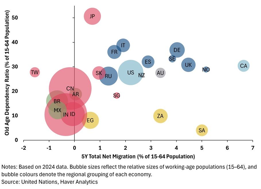 Migration, Workforces and the New Demographic Reality Immigration and labour market issues are likely to remain prominent in the year ahead, reflecting broader concerns about long-term demographic trends in the world economy. Many developed countries continue to face rapidly aging populations as fertility rates remain low or decline further. At the same time, political resistance to using immigration to offset labour shortfalls has intensified in recent years. This trend is evident in the popularity of leaders perceived as hawkish on immigration, including US President Trump, the rise of far-right voices in Europe, and more recently, Japan’s new Prime Minister Takaichi. Despite these debates, net migration in many developed economies has not been sufficient to meaningfully reduce old-age dependency ratios relative to developing countries, as shown in chart 11 below. Japan is a striking example. Even before the rise of its current Prime Minister, the country faced a combination of a high old-age dependency ratio and very low five-year net migration, both expressed as a percentage of the working-age population. This highlighted a deep-seated demographic challenge, one that could worsen under tighter immigration policies if no other viable alternatives emerge.