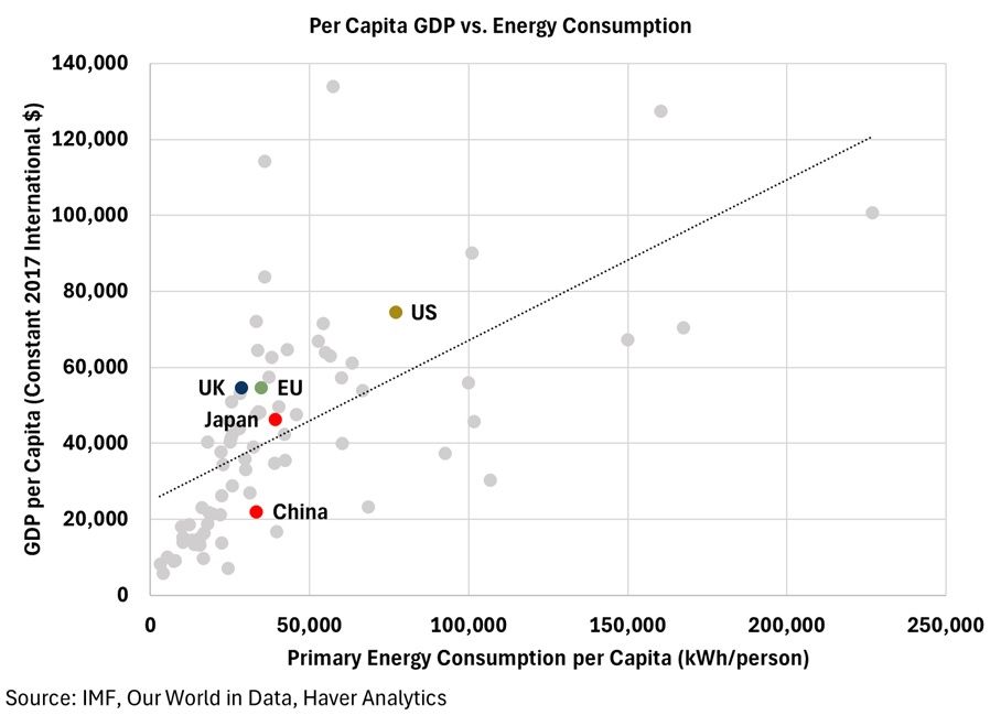 Energy and the AI Power Squeeze Layered on top of these fiscal concerns is a growing tension in global energy systems: whether supply can keep pace with the competing forces now driving demand sharply higher. AI is emerging as a particularly voracious consumer of electricity, with data-centre loads expanding so rapidly that several countries are already revising grid plans, pausing new connections, or ring-fencing capacity for strategic uses. But the AI surge is only one side of the story. Large emerging markets—India, Indonesia, Vietnam, Nigeria and others—are pushing through energy-intensive phases of industrialisation, and chart 5 below reinforces a familiar pattern: as economies climb the income ladder, per-capita energy consumption rises with them. Climate dynamics compound these pressures. More extreme heat is increasing cooling demand year-round, forcing households, firms and grids to draw more power simply to maintain normal activity. The result is a widening global energy trilemma: how to accommodate AI’s electricity appetite, support EM development, and cut emissions—all while managing increasingly fragile geopolitics. From Middle East supply risks to US–China competition over critical minerals and clean-tech supply chains, energy is once again a central axis of global conflict and coordination. And beneath it all lies the basic relationship shown in the chart: higher living standards remain tightly bound to greater energy use. In 2026, the world could feel that constraint more acutely than ever.