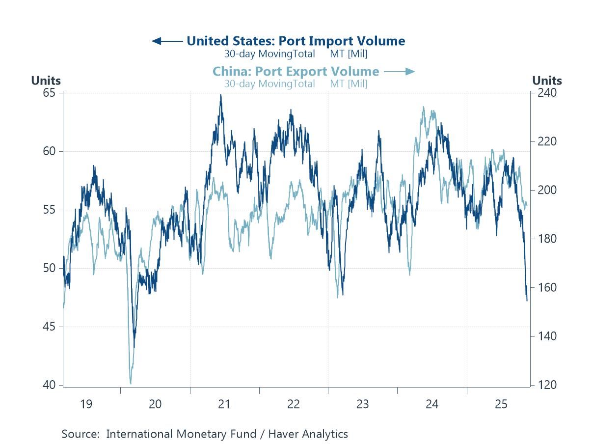The New Trade Shock: Tariffs, Tangles and Tactical Supply Chains While the global growth and trade backdrop ultimately proved better than investors had feared earlier in the year following President Trump’s initial tariff actions, much remains in flux in the year ahead. The US–China relationship, despite a recent, mildly conciliatory turn, remains fluid. Flashpoints and flare-ups in trade frictions remain possible, particularly in the absence of a comprehensive and conclusive trade agreement, with current concessions still only temporary. Uncertainty also surrounds the remainder of Trump’s previously threatened sectoral tariffs—such as those targeting semiconductors—which have yet to play out. A number of closely watched trade negotiations also hang in the balance, including prospective US bilateral deals with Canada and India. Meanwhile, US demand from its trading partners has already softened. As chart 7 below shows, US import shipments by weight have slid toward pandemic-era lows, while China’s export shipments have also declined.