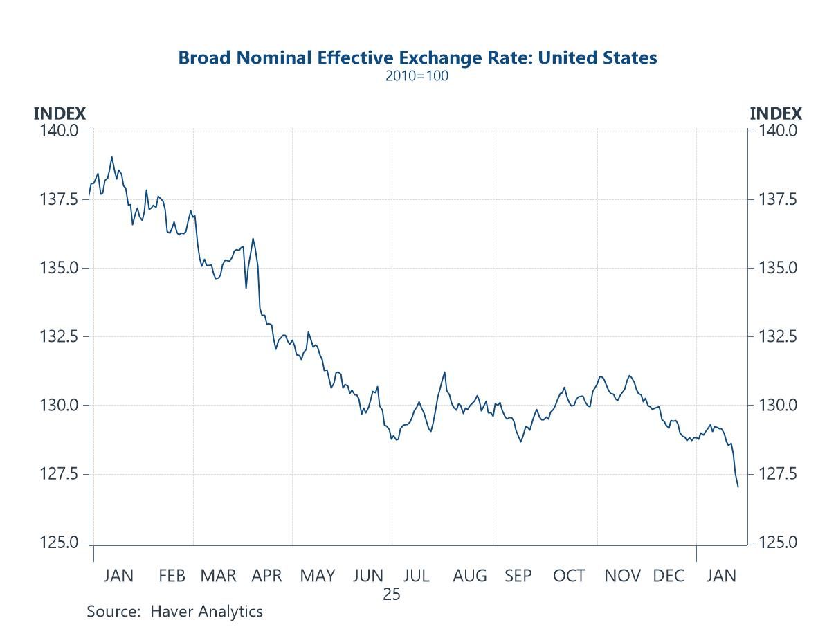 The US dollar Alongside the uneven global growth signals, financial markets have also begun to reflect a shifting pattern in demand for US assets. The chart below shows a notable depreciation in the broad nominal effective exchange rate of the US dollar through the first half of 2025, followed by a period of relative stabilisation in the second half of the year and a more abrupt weakening at the start of 2026. While the earlier decline likely reflected narrowing growth and interest-rate differentials, the recent sharper move points more clearly to changing capital-flow dynamics and a partial erosion of the dollar’s safe-haven appeal. Although far from a disorderly adjustment, the renewed softness has revived discussion of a broader “sell America” theme, suggesting that geopolitical uncertainty and policy risk may now be playing a larger role in currency markets alongside traditional cyclical drivers.