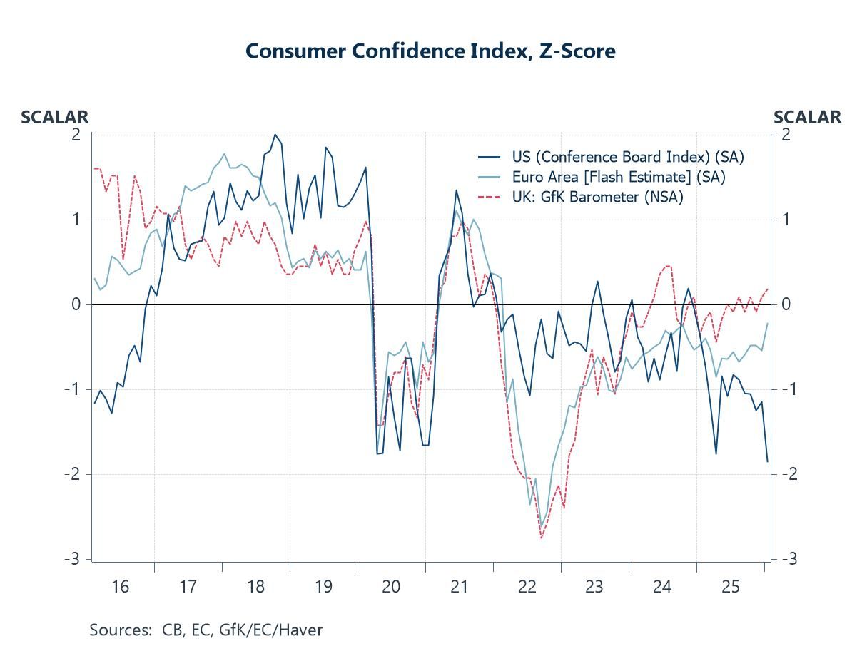 Consumer confidence in the US and Europe The recent depreciation in the US dollar has coincided with a marked relative weakness in US consumer confidence compared with other major economies. As the chart illustrates, this week’s data from the Conference Board revealed that US sentiment has fallen well below its long-run average and now sits at notably weaker levels than in both the euro area and the UK (based on normalised readings), where confidence has shown tentative signs of stabilisation. The deterioration in US readings appears less related to financial conditions and arguably more reflective of political uncertainty and a softening in labour-market perceptions.