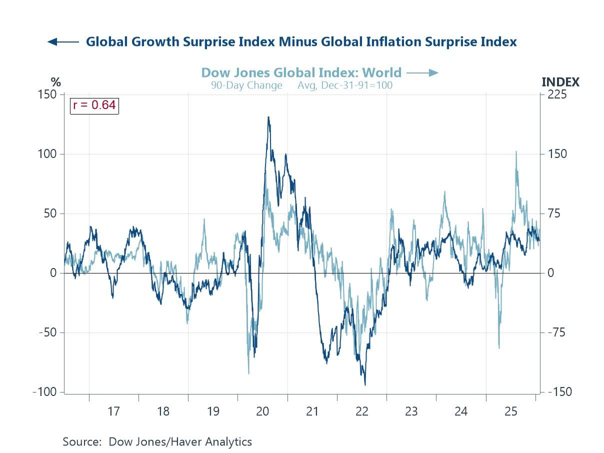 Financial markets and data surprises Despite the recent softness in the US dollar and signs of shifting capital flows, global equity markets have remained relatively upbeat, reflecting a still-supportive macro backdrop. As the chart illustrates, periods of stronger global growth surprises have tended to coincide with weaker inflation surprises, a combination that has historically been favourable for risk assets and has again been evident in recent months. This pattern tentatively points to an improving supply-side dynamic, where activity has been outperforming expectations without a corresponding resurgence in price pressures. One possible factor behind this development is the early impact of productivity-enhancing technologies, including artificial intelligence, which may be helping to lift growth while easing inflation constraints at the margin.