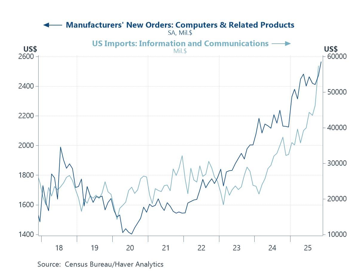 The US economy and AI Hard data released this week also continue to point to robust demand for advanced technology products in the US economy. The latest durable goods orders figures showed further strength in new orders for computers and related products, reinforcing the upward trend evident over the past two years. At the same time, recent trade data highlight a sustained rise in US imports of information and communications equipment, suggesting that domestic investment demand is being complemented by strong inflows of high-tech capital goods. Together, these series underscore the resilience of technology-related spending, consistent with ongoing investment linked to digitalisation, cloud infrastructure and artificial intelligence.