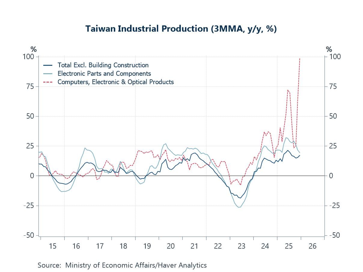 Industrial production in Taiwan The strength in US technology-related demand is also being echoed upstream in global supply chains, particularly in East Asia. As the chart shows, Taiwan’s industrial production has rebounded sharply over the past year, led by a pronounced acceleration in output of computers, electronic and optical products. Growth in electronic parts and components has likewise strengthened, outpacing the broader industrial sector and underscoring the central role of the semiconductor and advanced electronics cycle in the current upturn. This pickup aligns closely with the robust US orders and import data discussed above, suggesting that strong end-demand for high-tech equipment is translating into rising production across key manufacturing hubs.