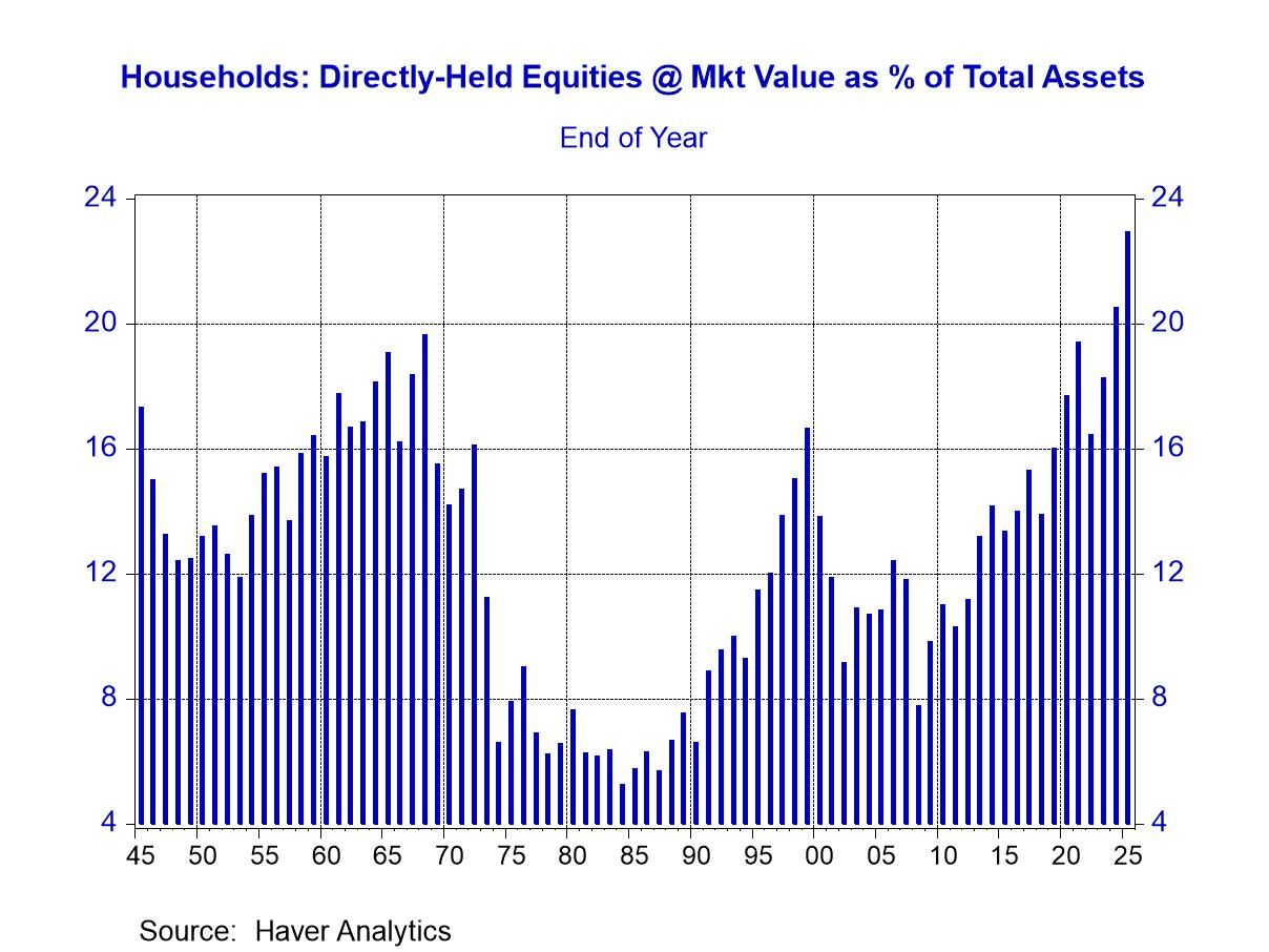 Let’s look at some data related to US equities first. Plotted in Chart 1 are the end-of-year values of directly-held equities held by households at market value as a percent of households’ total assets at market value. At the end of 2025, this percentage was 22.95, a post-World War II record high.