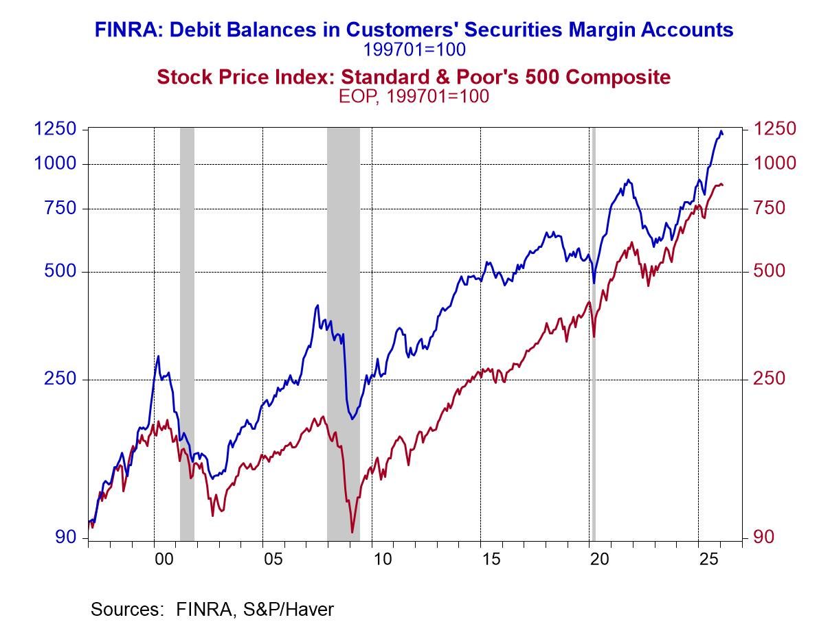 Plotted in Chart 2 are the end-of-month indices of debit balances in securities margin accounts and the S&P 500 stock index. The plot is in semi-log scale, which means that the slope of a line represents percent change. The February 2026 value of the debit balance in margin accounts is just off a record high.