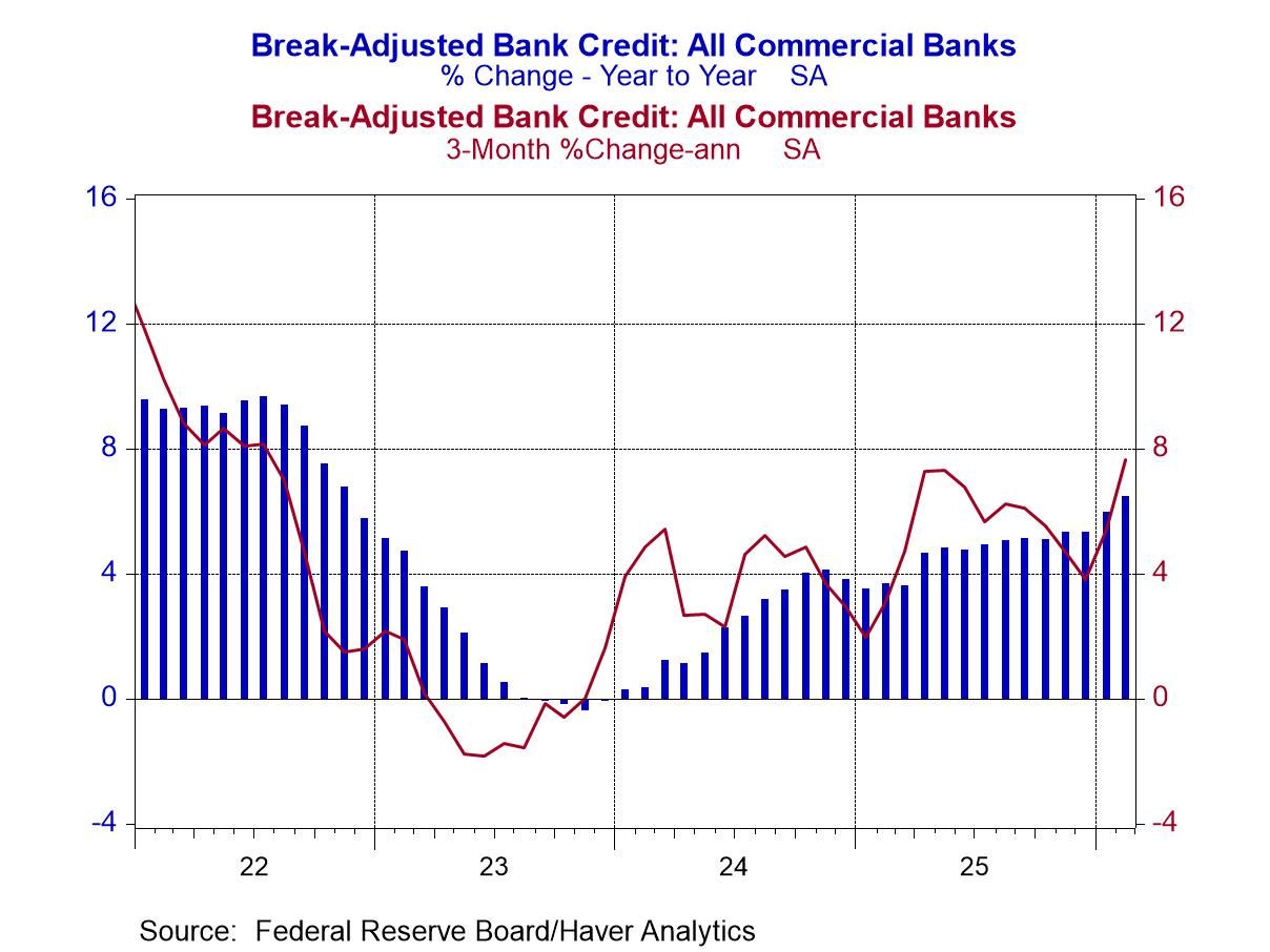 Speaking of money, more accurately, credit, commercial bank credit growth, the largest component of thin-air credit, is picking up. Year-over-year in February 2026, commercial bank credit growth was 6.46%. In the three months ended February 2026, commercial bank credit grew at an annualized pace of 7.65%. (See Chart 4.) This is the fastest growth in commercial bank credit since the inflationary days of 2022. Why would the Fed even consider lowering the federal funds rate with commercial bank credit growing solidly?