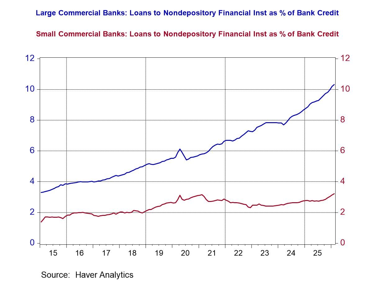 One of the categories of bank credit that is helping drive the faster growth in the total is Loans to Nondepository Financial Institutions. As can be seen in Chart 5, loans to nondepository financial institutions have been steadily rising as a percent of total bank credit for large commercial banks, especially so in the past two years. As of February 2026, these loans accounted for 10.3% of large commercial bank total bank credit, but only 3.2% for small commercial banks. What might these loans to nondepository financial institutions be for? My bet is that large banks are trying to get into the private-credit lending game indirectly by funding the institutions that are directly lending in the private credit market. In recent months, credit-quality problems have emerged in the private credit market.