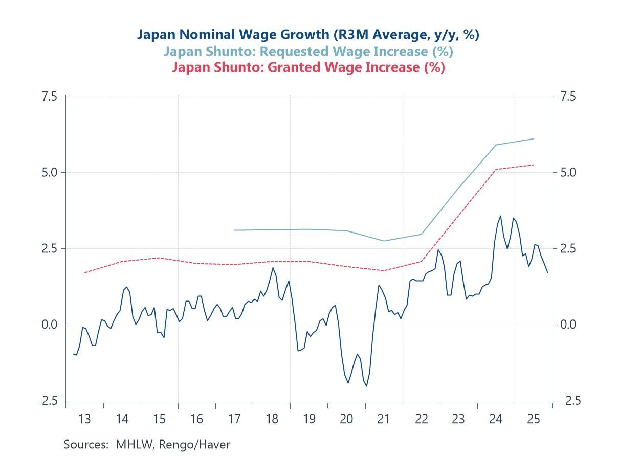 In Japan, Prime Minister Takaichi’s reported consideration of early snap elections, if enacted, would likely inject near-term political uncertainty (chart 3). However, should her gambit succeed, it could reduce policy uncertainty and pave the way for more fiscal policy activism. Against this backdrop, it is unsurprising that investors remain divided over the timing of the Bank of Japan’s next policy tightening, although the upcoming Spring wage negotiations (chart 4) ought to provide clearer signals for the monetary policy outlook.