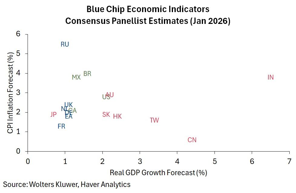 Blue Chip Economic Indicators Delving into the latest Blue Chip survey results, chart 5 summarizes panellists’ expectations for growth and inflation this year. Focusing on major Asian economies, and as in 2025, India is seen to be leading the pack in terms of both real GDP growth and CPI inflation. That said, the inflation outlook may be subject to further revisions should India’s currently muted inflation—driven by falling food prices—persist for longer. For China, panellists currently expect sub-5% growth this year, implying a likely miss should a 5% growth target again be pursued. Inflation in China is once again expected to remain subdued. Japan, meanwhile, is forecast to post sub-1% real GDP growth, while CPI inflation is expected to hover around the authorities’ preferred 2% level. Looking ahead, attention will also turn to the IMF’s upcoming World Economic Outlook forecasts, due later this month.