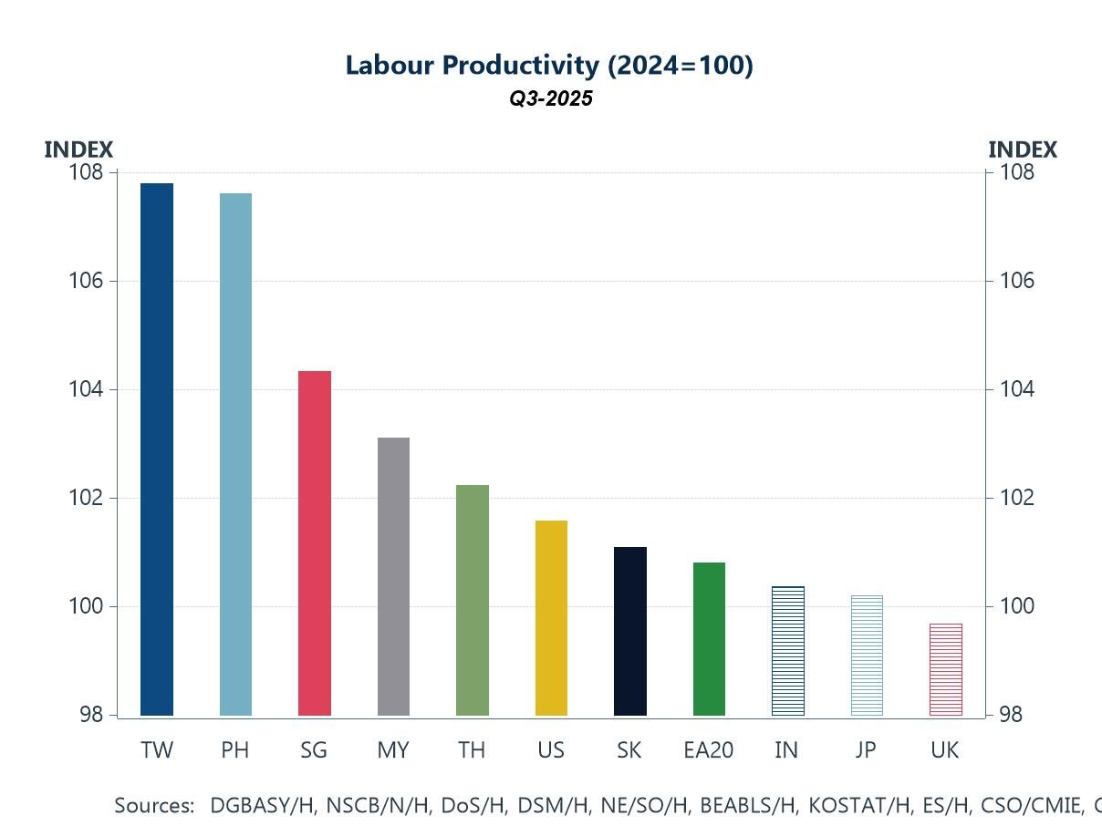 In our Letter this week, we delve deeper into AI, with a focus on Asia and, where relevant, comparisons with the US. The global economy remains firmly in the buildout phase of AI, where much of the near-term economic benefit is derived from investment in hardware and enabling infrastructure—such as AI chips, memory, and data centres. At the same time, though still at a relatively early stage, firms are beginning to adopt advanced AI capabilities and integrate them into workflows in pursuit of productivity gains. So far, labour productivity improvements have been evident in parts of Asia (chart 1), largely driven by stronger exports (chart 2) and capital deepening—similar to trends observed in the US (chart 3) and, within Asia, in economies such as Malaysia (chart 4). However, these gains have yet to translate into a clear and sustained acceleration in total factor productivity (TFP), which accounts for the combined use of labour, capital, and other inputs—though TFP is admittedly a challenging metric to estimate, as illustrated by the US case (chart 5). This raises an important question: what happens when the AI buildout phase begins to moderate, and the associated investment-led tailwinds fade? At that point, further AI-related gains will depend more heavily on the successful embedding and diffusion of AI across sectors. On this front, Asian economies remain at very different stages of readiness to adopt AI (chart 6), suggesting that the next phase of productivity gains may be uneven across the region.