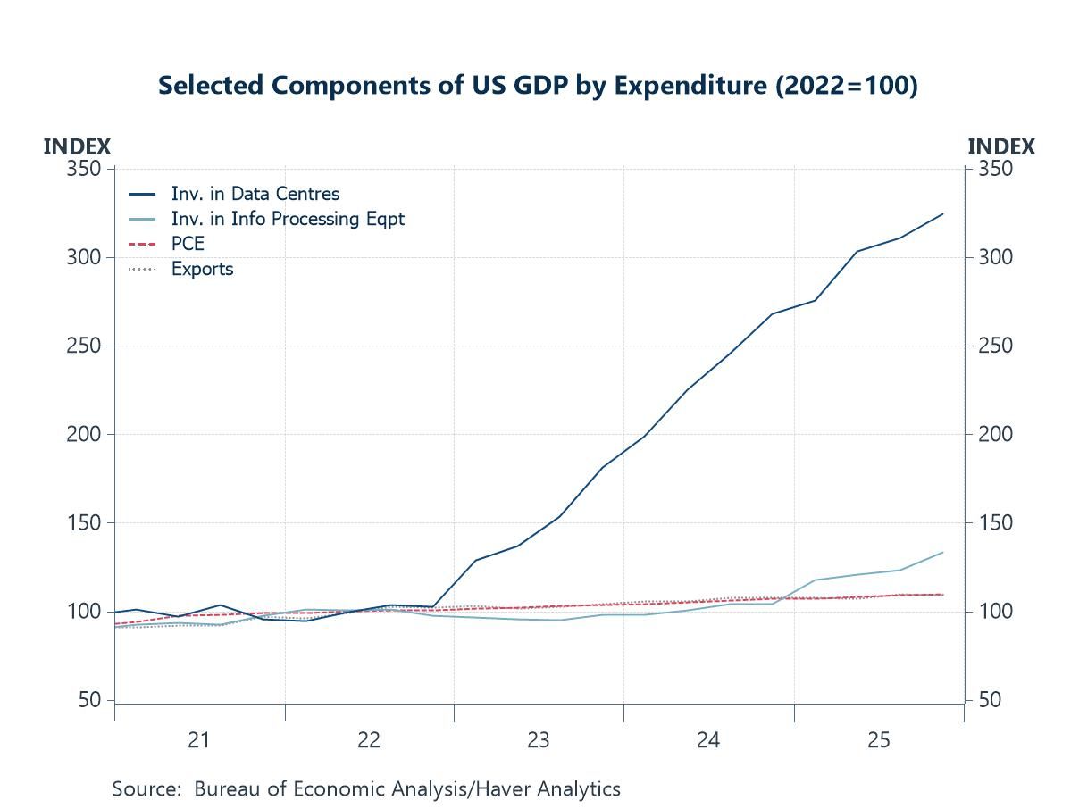 Capital deepening Another key channel through which labour productivity can be achieved—aside from reducing the denominator (employment)—is capital deepening, or an increase in capital per worker. On this front, some advanced economies, including the US, have already moved in this direction as firms ramp up investment in AI-related infrastructure and equipment. In recent years, growth in investment in information processing equipment and data centres has outpaced other demand components, such as consumption and exports, reflecting in part the ongoing AI-related buildout (chart 3).
