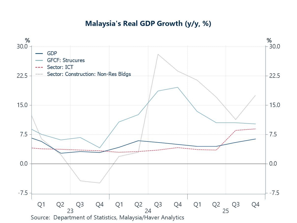 The growth-enhancing—and by extension productivity-supporting—effects of such AI-related capital deepening are also evident in parts of Asia. In Malaysia, for example, the rapid expansion of its data centre industry has spurred strong gains in investment and construction activity, alongside spillovers to related sectors (chart 4). Importantly, these AI-related, investment-led gains are not limited to data centre development. Capital outlays to expand production capacity for AI-related goods—such as semiconductor fabrication and advanced chip manufacturing—operate through the same channel, increasing the capital stock and, over time, lifting output per worker.