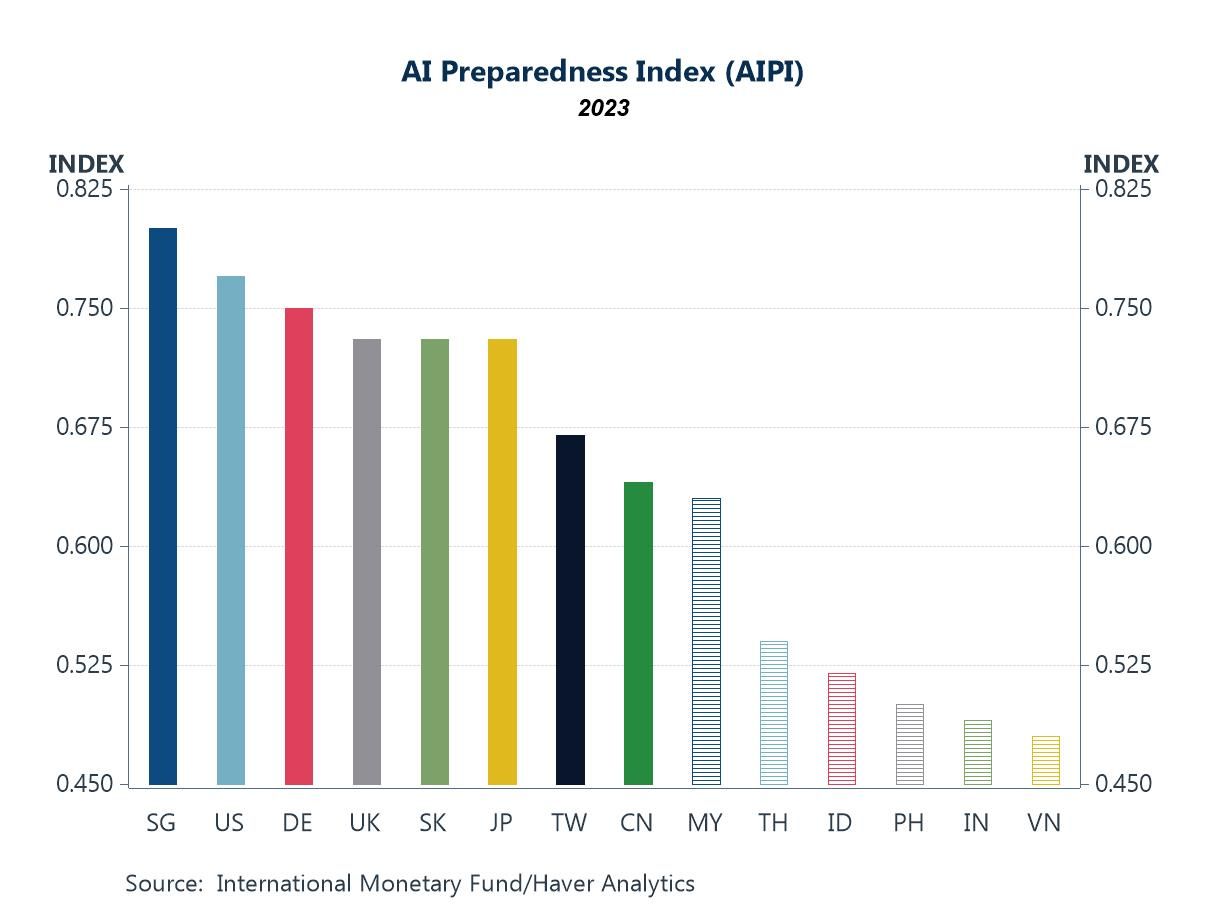 Another key dimension to monitor is how prepared Asian economies are to embrace AI and embed it effectively in order to capture its anticipated productivity gains. While many economies in the region are currently benefiting from labour productivity gains—driven by stronger manufacturing activity and exports of AI-related goods and infrastructure—such gains may eventually moderate, particularly once the initial buildout phase peaks. At that stage, the more durable benefits will need to come from a different channel: the total factor productivity gains associated with the actual adoption and diffusion of AI across industries. On this front, Asian economies differ markedly in their readiness. As shown in chart 6, an IMF index—incorporating factors such as digital infrastructure, innovation capacity, human capital, and regulatory frameworks—highlights this divergence. More advanced economies, including Singapore, South Korea, and Japan, rank highly, while others such as Vietnam, India, and the Philippines lag behind. That said, the concerted efforts by several developing Asian governments in recent years to strengthen digital infrastructure, upgrade skills, and refine regulatory frameworks suggest that this gap could narrow over time.