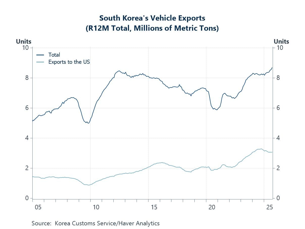 Beyond the headline-grabbing US–China trade deal, the APEC Summit in South Korea also saw the US reach a trade agreement with South Korea. Under the deal, US tariffs on South Korean autos and auto parts have fallen to 15% from 25%, matching the US tariff rate on Japanese autos and providing relief to South Korea’s sizable automotive export sector (chart 2). The agreement also clarified South Korea’s supposed $350 billion investment in the US: $200 billion in cash, capped at $20 billion per year to avoid currency market distortions, with the remaining $150 billion directed toward shipbuilding cooperation. While also not a major breakthrough, the deal represents incremental progress, addressing prior uncertainties and signalling steps toward a more favourable trade framework.