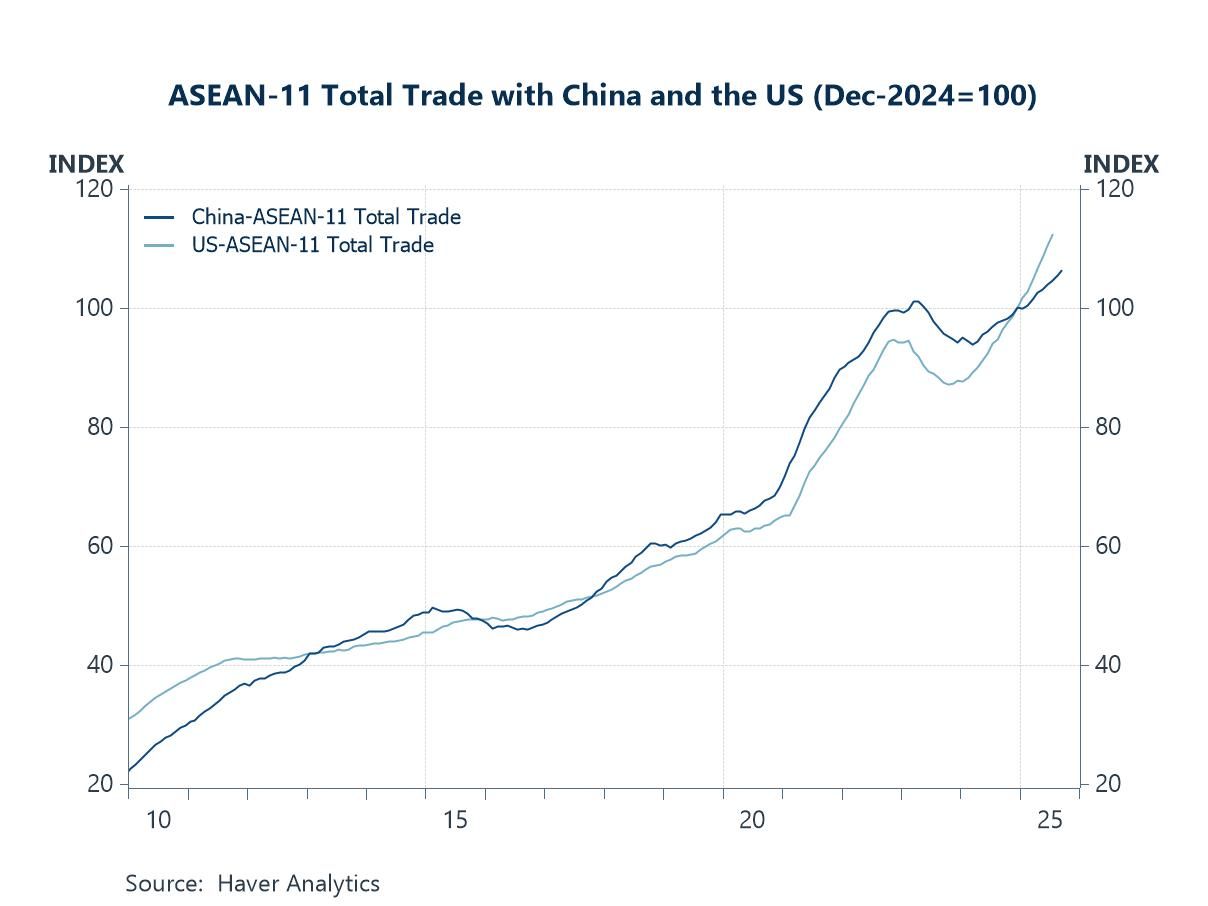 The accession of Timor-Leste into ASEAN aside, last week’s summits also brought a number of economic developments for the bloc. More concretely, ASEAN and China signed an upgrade to their free trade agreement last week, bringing the deal to so-called version 3.0. The upgraded deal (ACFTA 3.0) introduces commitments in new areas such as Digital Economy, Green Economy, and Supply Chain Connectivity, among other themes. And notably, just as the US and ASEAN have found common ground to collaborate in fields such as those relating to rare earths, given how the US has seen vulnerabilities arising from this space given China’s dominance in the field, China has taken the year’s US-China frictions to foster closer ties with its neighbours in the region, including the collectively sizable ASEAN bloc. Just by the trade dimension alone, China-ASEAN-11 trade has growth significantly this year (chart 2), although the economies’ total trade with the US also rose, and at a more significant pace, despite tariff measures.