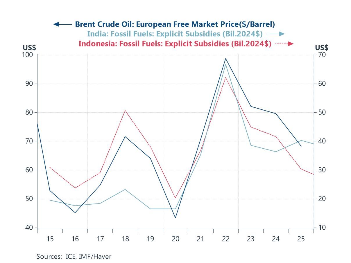 The fiscal costs of the Middle East conflict As the Middle East conflict drags on, so too does the strain on fiscal resources across parts of Asia, as the costs of energy-related subsidy programmes continue to mount. While such programmes have an immediate, direct, and tangible impact in shielding households from surging energy costs, they are far from sustainable, particularly if oil prices remain well above targeted levels or stay elevated for an extended period. As chart 2 illustrates, the costs of these explicit subsidy programmes tend to rise closely with crude oil prices, as seen in India and Indonesia. Other measures adopted elsewhere, such as drawing down oil reserves, may be less fiscally costly, but are similarly difficult to sustain indefinitely. In both respects, the clock is ticking, and the world continues to hold its breath as the conflict drags on.