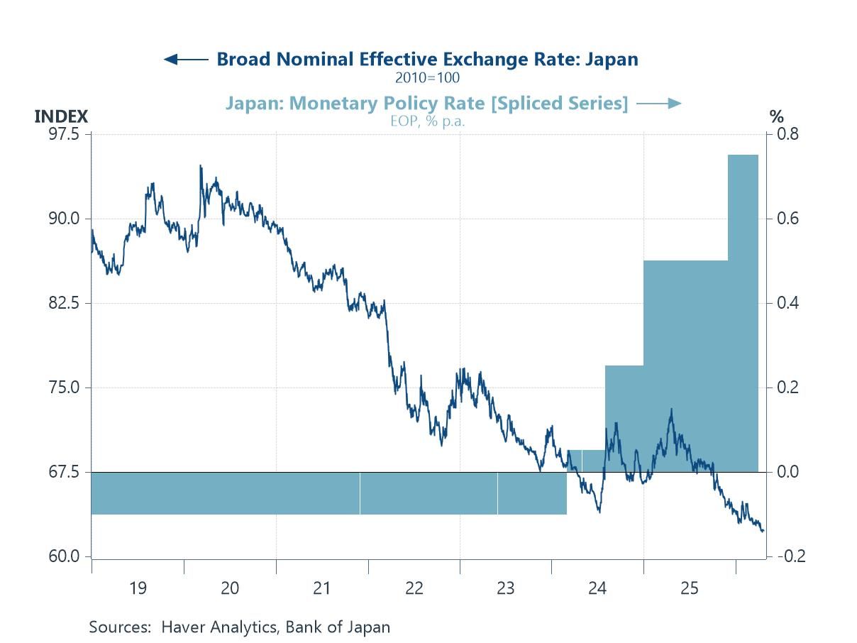 The week ahead Looking to the week ahead, a major central bank decision looms in Japan. Market expectations for the Bank of Japan to deliver a rate hike at its April meeting have ebbed amid the persistence of the Middle East conflict, to which Japan remains particularly vulnerable given its reliance on oil imports flowing through the Strait of Hormuz. At the same time, inflation in Japan has yet to become a major concern, with recent readings having picked up but not yet entering troubling territory. One potential source of concern, however, lies with the Japanese yen, which has remained on a weakening trend since early last year (chart 4). That depreciation has been one of the key arguments underpinning calls for further rate hikes.