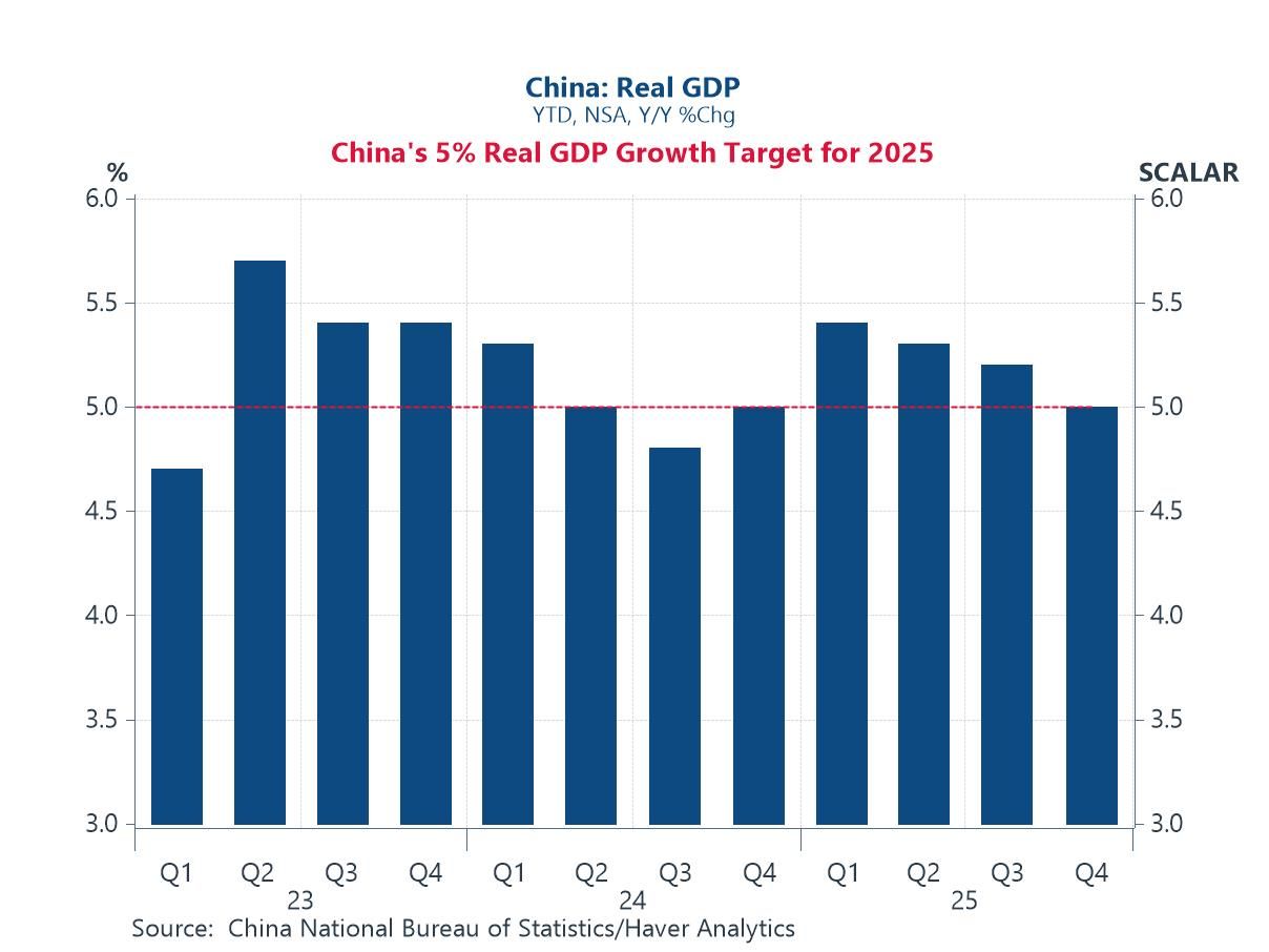 China Alongside its regular slate of monthly economic releases, China unveiled its Q4 GDP figures earlier today, with the economy expanding by 4.5% y/y during the quarter. While Q4 growth continues the recent trend of deceleration seen over the past few quarters, the outcome brings China’s full-year growth for 2025 right in line with the government’s 5% target (chart 1). This defied expectations among some investors that the economy would fall short. This outcome aligns with earlier discussions that China remained within reach of its growth target despite slowing momentum. That said, the outlook ahead remains challenging. December’s monthly data painted a mixed picture, with declines in fixed asset investment accelerating and retail sales growth cooling further, even as industrial production growth remained relatively resilient.