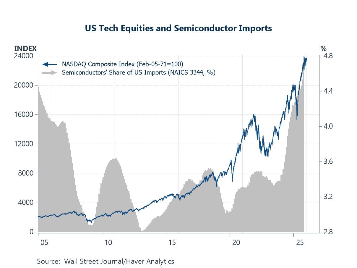 Not long after the tariff announcement, the US and Taiwan — the largest source of US semiconductor imports, as shown in chart 4 — were reported to have reached a trade deal. Under the agreement, Taiwanese chipmakers such as TSMC that expand production in the US will face lower tariffs on semiconductors and related manufacturing equipment, with duty-free treatment applying to some imports. In addition, tariffs on most other Taiwanese exports to the US will be reduced to 15% from 20%. In return, Taiwanese companies will invest $250 billion in the US, including an expanded manufacturing footprint by TSMC in Arizona, aimed at boosting domestic production of semiconductors, energy, and AI. As illustrated in chart 4, Taiwan already dominates US semiconductor imports, with its share having risen sharply in recent years and far outstripping contributions from other major suppliers such as Southeast Asian economies and South Korea.