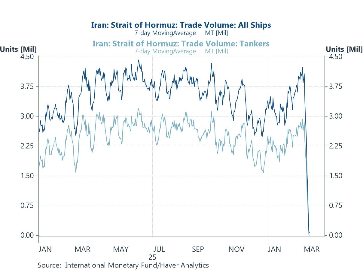 To illustrate the severity of the current choke point along the Strait of Hormuz, chart 2 shows the 7-day moving average of shipping volumes through the strait, based on estimates from the International Monetary Fund. The average has effectively fallen to zero for tanker traffic, while overall shipping volumes—including container ships, dry bulk carriers, and other vessels—have also dropped close to zero. This stands in stark contrast to the multi-million metric tons of average daily shipping volumes typically observed previously. While such shipping estimates may not capture every vessel and can be partially circumvented, the broader picture remains clear: the flow of energy—the lifeblood of the global economy—is now severely constrained. Strategic reserves may provide a temporary buffer, but a prolonged blockage would be difficult to sustain indefinitely and could carry significant economic consequences.