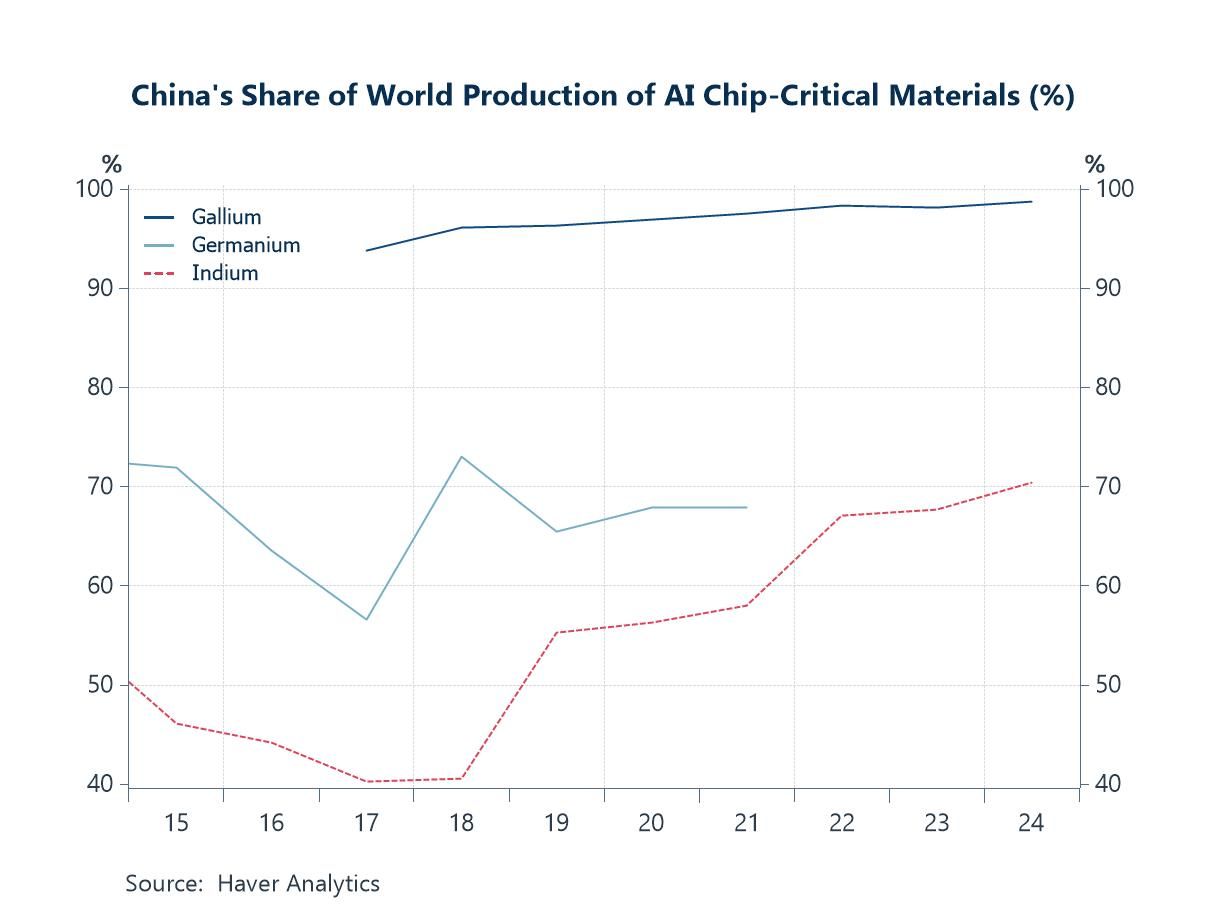 AI chip material production We begin with the most critical raw inputs required to produce AI chips. Beyond silicon—the foundational material on which chips are built—China commands substantial market share and dominance in the production of other key chipmaking materials, notably gallium and germanium. China accounts for a near-total share of global gallium production and roughly 68% of germanium output (chart 1), levels that effectively give it the ability to steer these markets. China has demonstrated this leverage before, most recently through temporary export restrictions on critical minerals enacted last year amid tit-for-tat measures between the US and China. Those controls were eventually paused following a subsequent US–China trade agreement. Even so, the episode served as a stark reminder of China’s strong negotiating position in the semiconductor supply chain—despite the US retaining leadership in the sophistication and advancement of AI models.