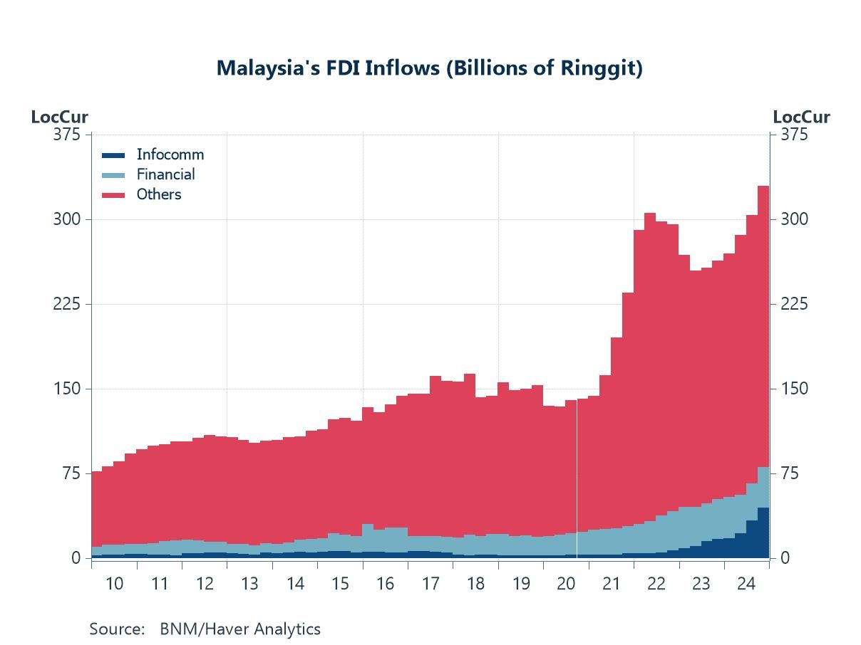 We begin with first principles, looking at the raw material inputs required to produce AI chips, where China continues to hold a dominant position (chart 1). We then turn to the chips themselves, highlighting Taiwan’s well-known leadership in advanced semiconductor manufacturing and its critical role for both the US and China (chart 2). That said, recent efforts by both the US and China to reduce external dependence are beginning to show up in the data (chart 3), and could reshape this landscape in the years ahead. Next, while the US still leads in data centre capacity—the infrastructure essential for training and deploying AI models—several Asian economies, notably Malaysia, are seeking to capture a larger share of this rapidly expanding segment. These efforts have been met with strong interest from global technology firms, translating into sizable foreign direct investment inflows (chart 4).