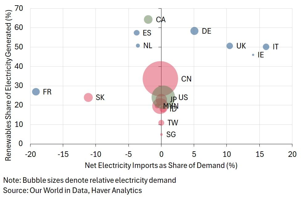 Additionally, many developed economies have, over the past decades, increased the share of renewable energy in their overall energy mix. While this shift is socially responsible, particularly in terms of reducing carbon footprints, it has also tended to coincide with higher electricity prices. This reflects the fact that many renewable energy sources have yet to reach efficiency levels that make them fully cost-competitive with fossil fuels. At the same time, geopolitical flashpoints, notably the Russia–Ukraine war, have underscored the risks of inadequate energy security. Repeated disruptions stemming from other tensions, including US trade actions, have further pushed past ambitions for a rapid green transition out of the spotlight Compounding these challenges, the immense energy demands associated with AI, together with the continued availability of relatively cheap fossil fuels, create a strong temptation for some countries to slow the pace of their energy transition—or, in some cases, risk reversing earlier progress. This challenge is also faced by Asian economies seeking to capture a larger share of the AI value chain.