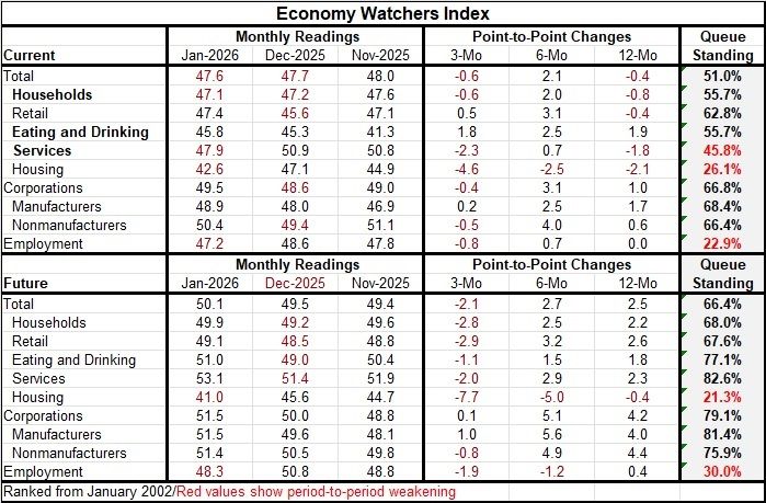 The future index The future readings from the economy watchers index show continued but slight increases over the last few months. Only two future readings weaken month-to-month: housing and employment—once again two key readings as far as consumers are concerned. However, in terms of current monthly diffusion readings, the assessment of households, retailing, housing, and employment all have current diffusion values below 50, indicating net declines rather than increases. The percentile standing is for the future index are, like those for the current index, generally upbeat - and generally stronger than for the current indexes - with the future headline posting a 66.4 percentile standing in January. However, like the current index, the standing for housing is at its 21.3 percentile and the standing for employment is at its 30th percentile, both well below the neutral level that would place the ranking at the 50th percentile. Corporations show high readings, higher for the future indexes than for the current index standings. There also are high readings and standings for eating and drinking places as well as services. It's good to see services come up with a strong rating since it creates hope for the future for employment because services are the core employment sector. It will be interesting to see how this value changes in the coming months as Takaichi’s new policies are implemented and take hold.