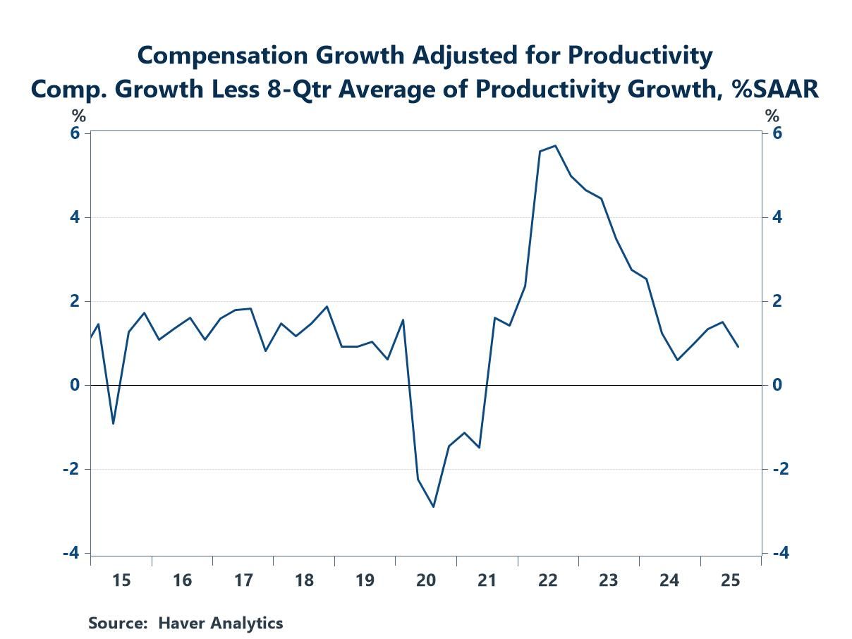 Most of the deceleration occurred in the goods-producing sector, where the latest increase of 2.5% (annual rate) trailed the average of 3.9% in the prior three quarters. The service sector saw compensation growth of 3.1%, down from an average of 3.5% in the prior three quarters. The difference between the performances of goods and service is not surprising, as compensation growth in the goods-producing sector tends to be more volatile, and it has typically been softer in the past few years.