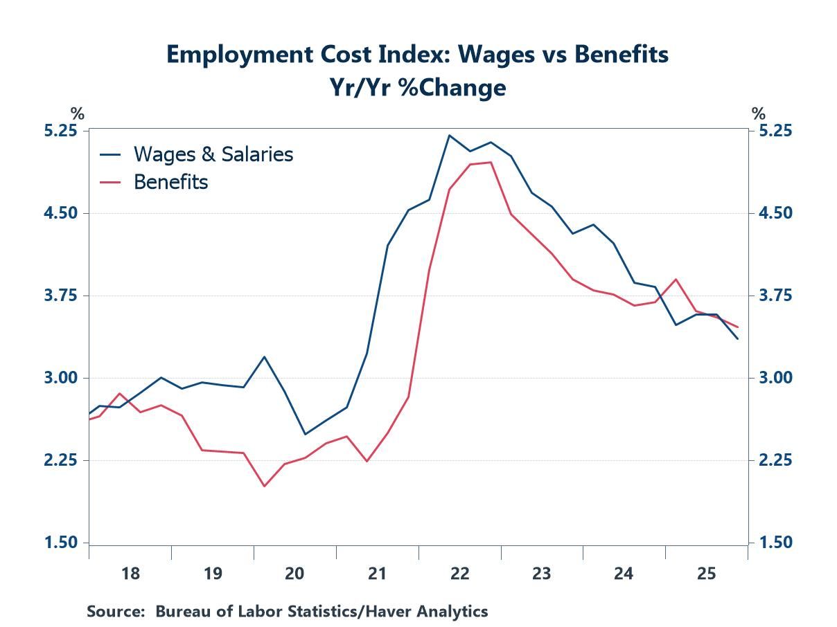Total compensation in the ECI includes both wages and benefits. In the third quarter, both components rose by the same amount (0.7% quarter-to-quarter, or 3.0% at an annual rate). This balance is a shift from the pattern of recent years, when wages typically posted firmer growth. The advantage to wages in the past few years, in turn, represents a break from the more common tendency for benefits to grow at a faster pace.