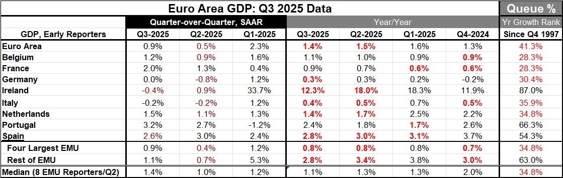 Looking at growth in terms of the four largest EMU economies versus the rest, large economy growth notched 0.9% in the third quarter in terms of quarter-to-quarter changes compared to 0.4% in the second quarter. Euro area growth for the large economies was unchanged 0.8% in the third quarter; in fact, it has grown by 0.8% year-over-year in the first quarter, second quarter, and third quarter of 2025. The rest of the monetary union shows growth accelerating in the third quarter to 1.1% from 0.7% in the second quarter. However, the year-over-year growth rate for the rest of the monetary union drops down to 2.8% in the third quarter from 3.4% in the second quarter and that compares to 3.8% in the first quarter.